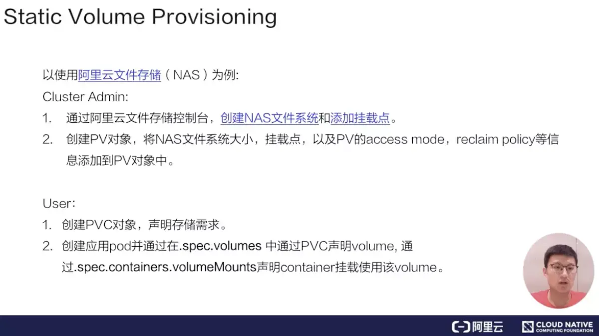 先看一个静态 PV 创建方式。静态 PV 的话,首先是由管理员来创建的,管理员我们这里以 NAS,就是阿里云文件存储为例。我需要先在阿里云的文件存储控制台上去创建 NAS 存储,然后把 NAS 存储的相关信息要填到 PV 对象中,这个 PV 对象预创建出来后,用户可以通过 PVC 来声明自己的存储需求,然后再去创建 pod。创建 pod 还是通过我们刚才讲解的字段把存储挂载到某一个容器中的某一个挂载点下面。