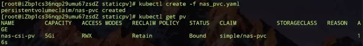 volumeAttributes 是我在阿里云 nas 控制台预先创建的 NAS 文件系统的相关信息,我们主要需要关心的有 capacity 为 5Gi; accessModes 为多 node 读写访问; reclaimPolicy:Retain,也就是当我使用方的 PVC 被删除之后,我这个 PV 是要保留下来的;以及在使用这个卷的过程中使用的 driver。