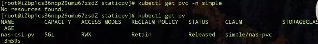 上图显示,它已经被删掉了。再看一下,刚才的 nas PV 还是在的,它的状态是处在 Released 状态,也就是说刚才使用它的 PVC 已经被删掉了,然后它被 released 了。又因为我们 RECLAIN POLICY 是 Retain,所以它这个 PV 是被保留下来的。