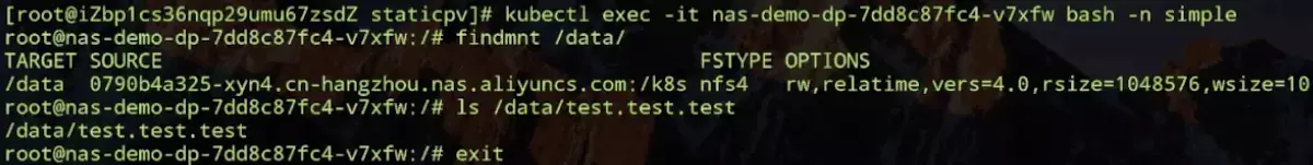 如下图所示:我们也 findmnt 一下,可以看到,这两个 pod 的远程挂载路径一样,也就是说我们用的是同一个 NAS PV,我们再看一下刚才创建出来的那个是否存在。