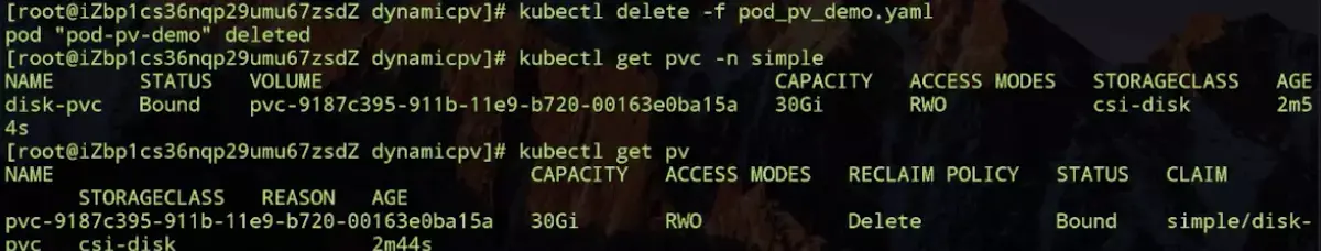 接下来我会把 PVC 删掉,看一下 PV 会不会根据我们的 reclaimPolicy 随之删掉呢?我们先看一下,这个时候 PVC 还是存在的,对应的 PV 也是存在的。