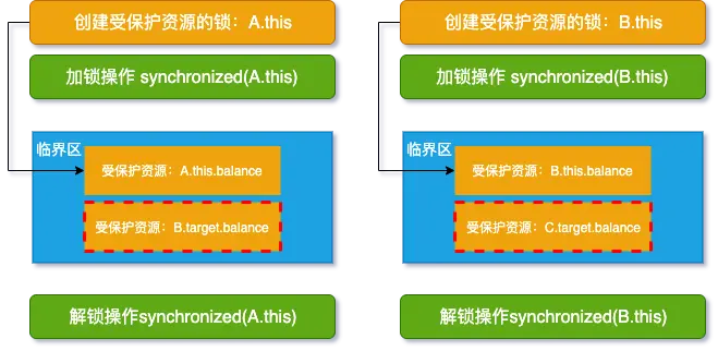 - 线程 2 执行 transfer 方法锁定的是 B 的实例(B.this),并没有锁定 C 的实例