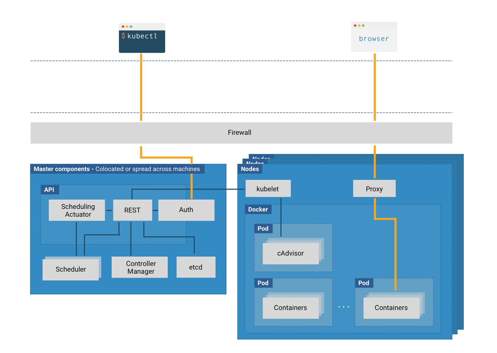 Kubernetes 是一个复杂的系统,下图展示了一个集群不同的组成部分,为了保证集群整体的安全,需要仔细保护每一个组件。