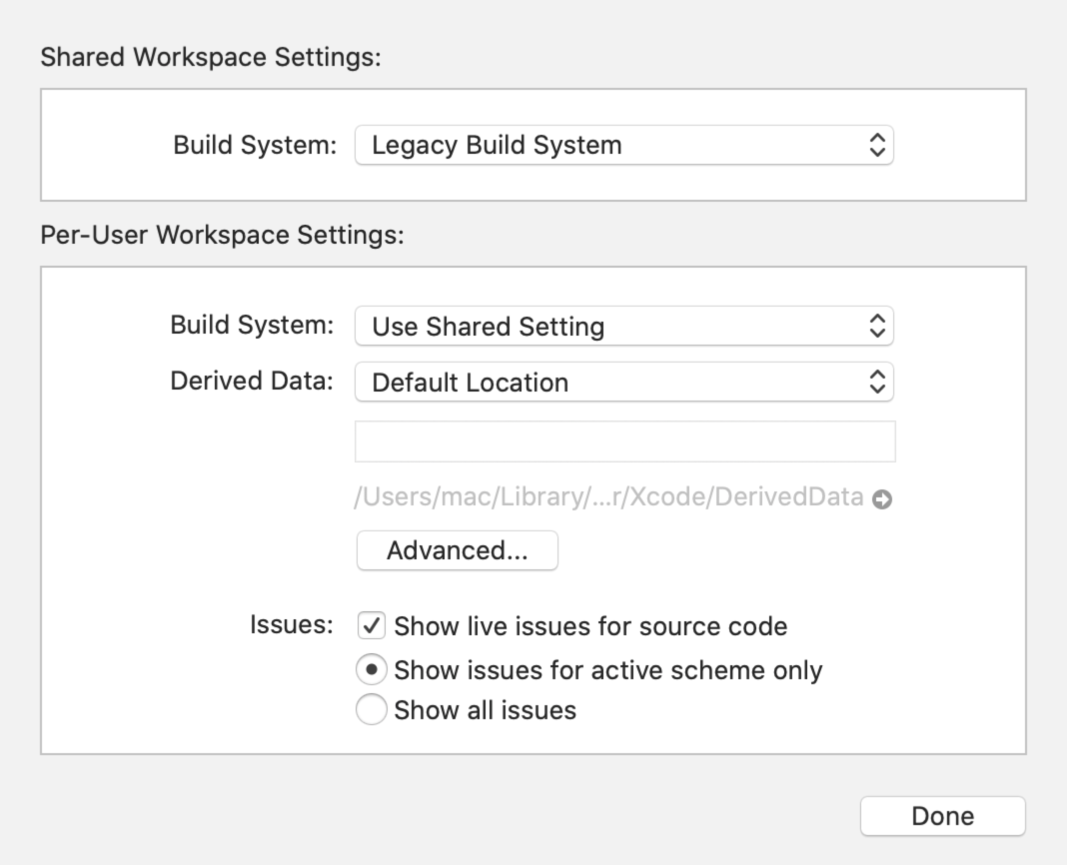 Xcode11项目报错Multiple commands produce 剑客十八 2019-10-16 1,819 阅读1分钟 Xcode升级后发现了一个老问题解决办法:进入Xcode -> File -> Workspace Settings下选择Legacy Build System