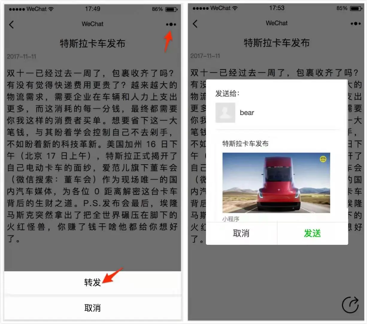 接下来我将介绍两种方式来实现分享功能,一种是最常规的也是最普通的,点击右上角的菜单,使用弹出的菜单项中分享菜单项。 另一种方法是自定义一个分享按钮,用户点击按钮后即弹出确认分享框,该方法灵活性强,并且比第一种少操作了一步。好了,让我们开始吧。