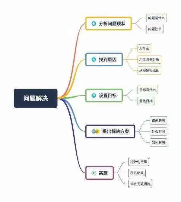分析问题>找到原因>设置目标>提出解决方案>实施