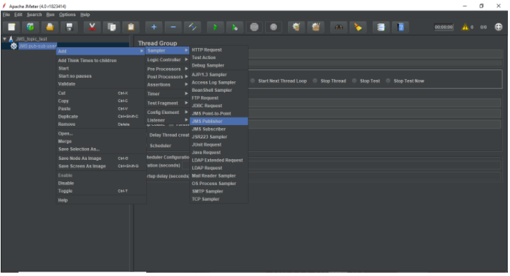>>选择JMS pub-subuser元素(线程组),然后右键单击所选项。