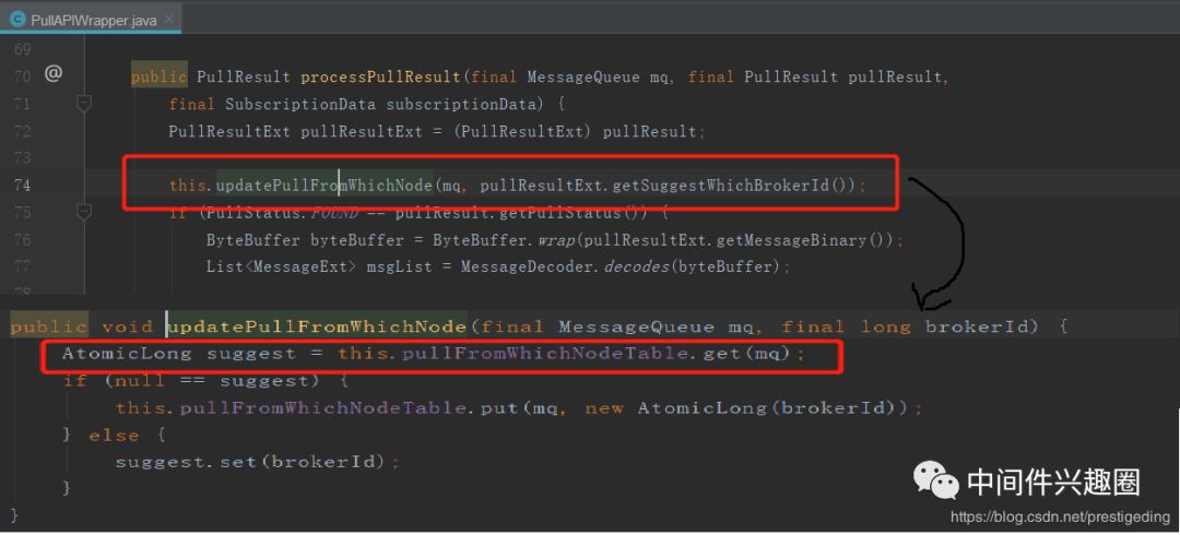 消息拉取实现PullAPIWrapper在处理拉取结果时会将服务端建议的brokerId更新到broker拉取缓存表中。