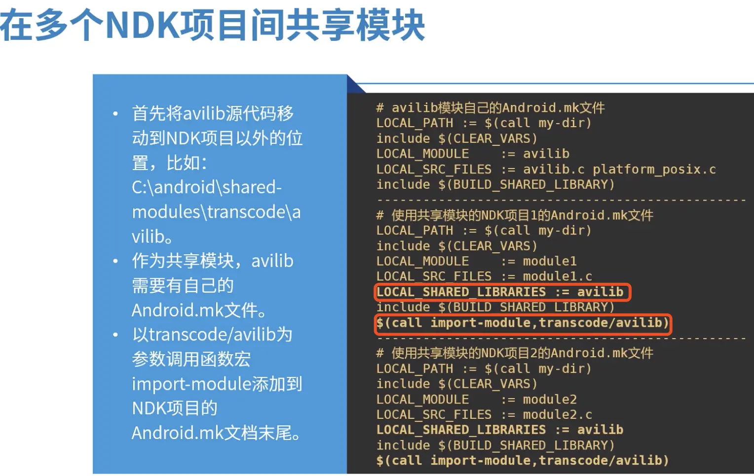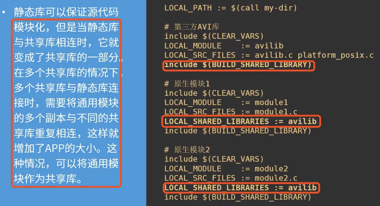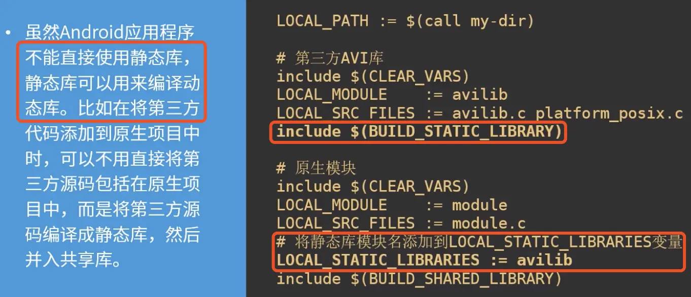 Android.mk是一个面向Android NDK构建系统描述NDK项目的GNU makefile片段。主要用来编译生成以下内容: