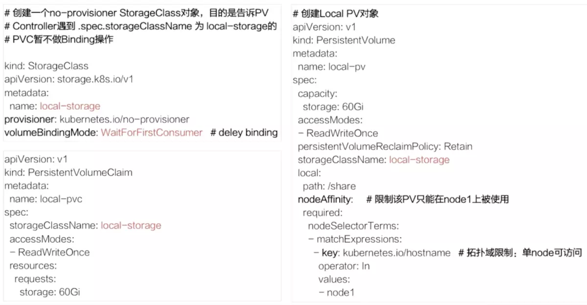 Local PV 大部分使用的时候都是通过静态创建的方式,也就是要先去声明 PV 对象,既然 Local PV 只能是本地访问,就需要在声明 PV 对象的,在 PV 对象中通过 nodeAffinity 来限制我这个 PV 只能在单 node 上访问,也就是给这个 PV 加上拓扑限制。如上图拓扑的 key 用 kubernetes.io/hostname 来做标记,也就是只能在 node1 访问。如果想用这个 PV,你的 pod 必须要调度到 node1 上。