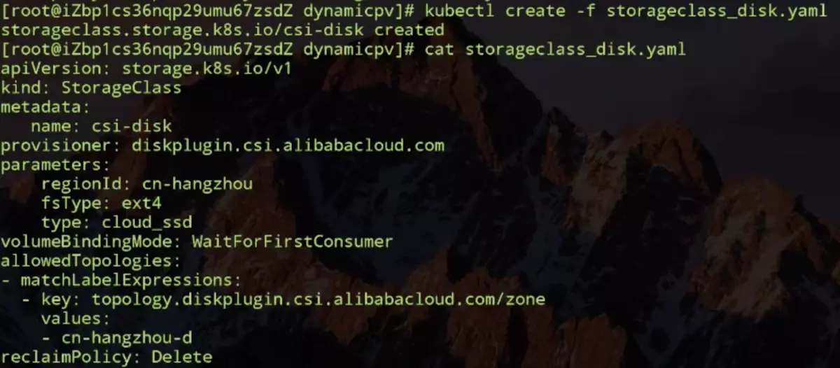 接下来看一下动态 PV 创建的过程加上一些拓扑限制,首先将的 storageclass 创建出来,然后再看一下 storageclass 里面做的限制,storageclass 首先还是指定它的 BindingMode 为 WaitForFirstConsumer,也就是做延迟绑定,然后是对它的拓扑限制,我这里面在 allowedTopologies 字段中配置了一个可用区级别的限制。