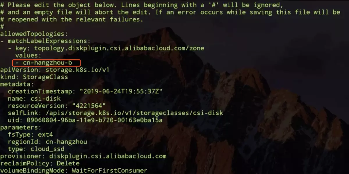 这就导致最终没办法将 pod 调度在这两个 node 上。现在我们修改一下 storageclass 中的拓扑限制,将 cn-hangzhou-d 改为 cn-hangzhou-b。