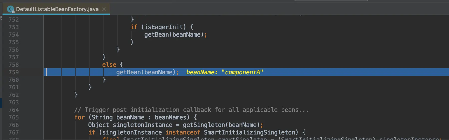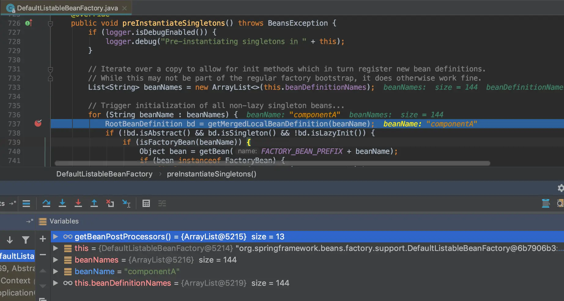 BeanDefinitionNames,F9找到上面我们想要看到初始化过程的Bean。下文提到的所有F7、F8、F9分别代表进入方法内部、跳到下一行、跳到下一个断点处。