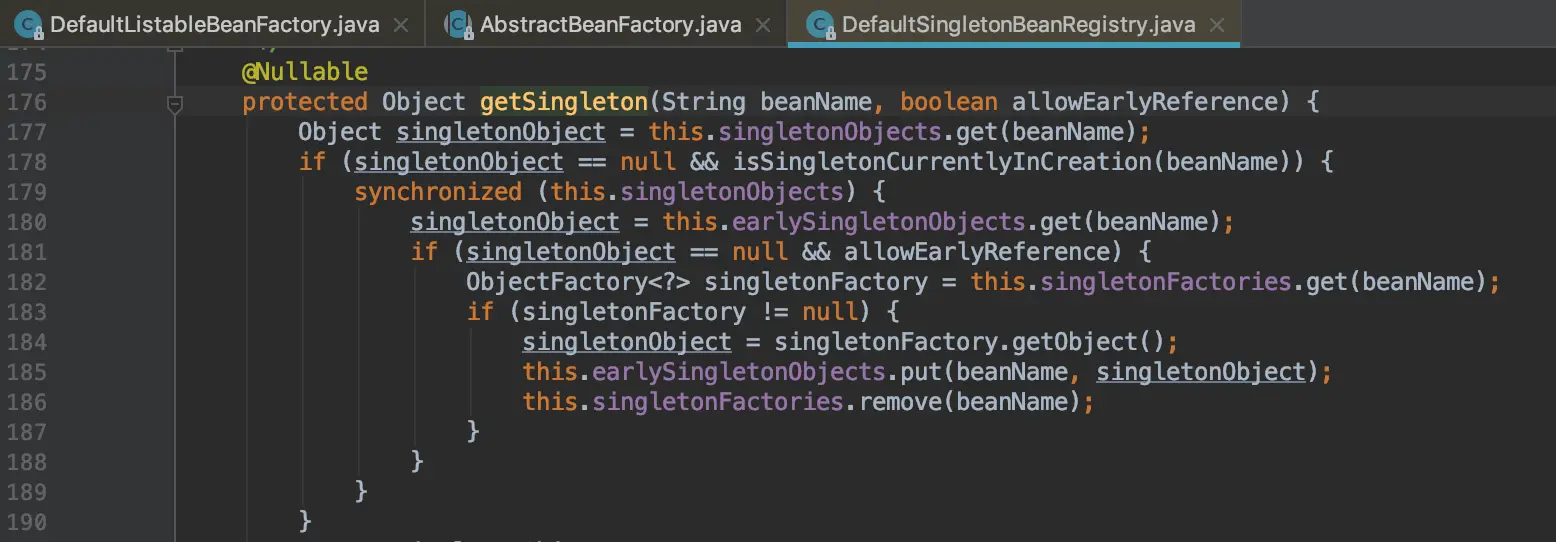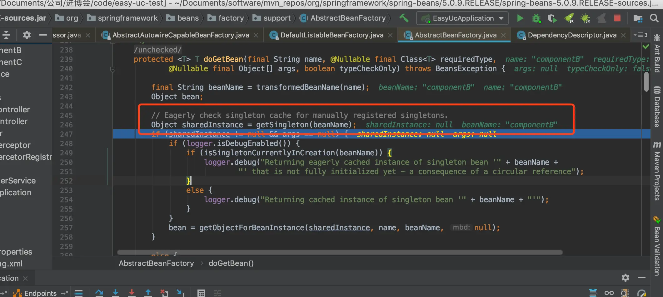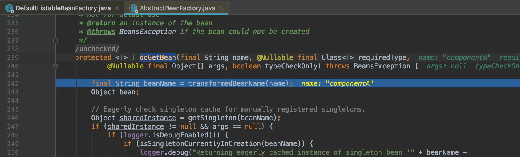 F7进入doGetBean方法 进入到这个方法后,看下246行,它最终会进入到DefaultSigletonBeanRegistry中的getSingleton 到这先认识下这三个缓存Map:- singletonObjects: singleton object cache