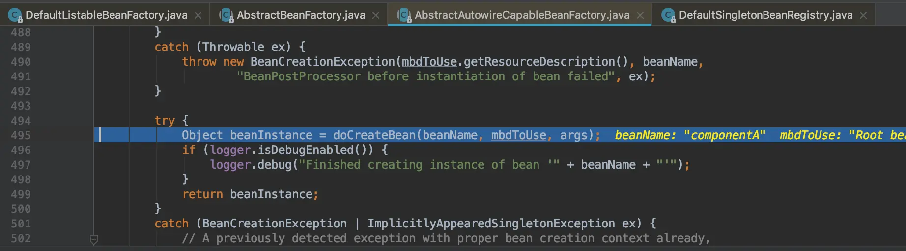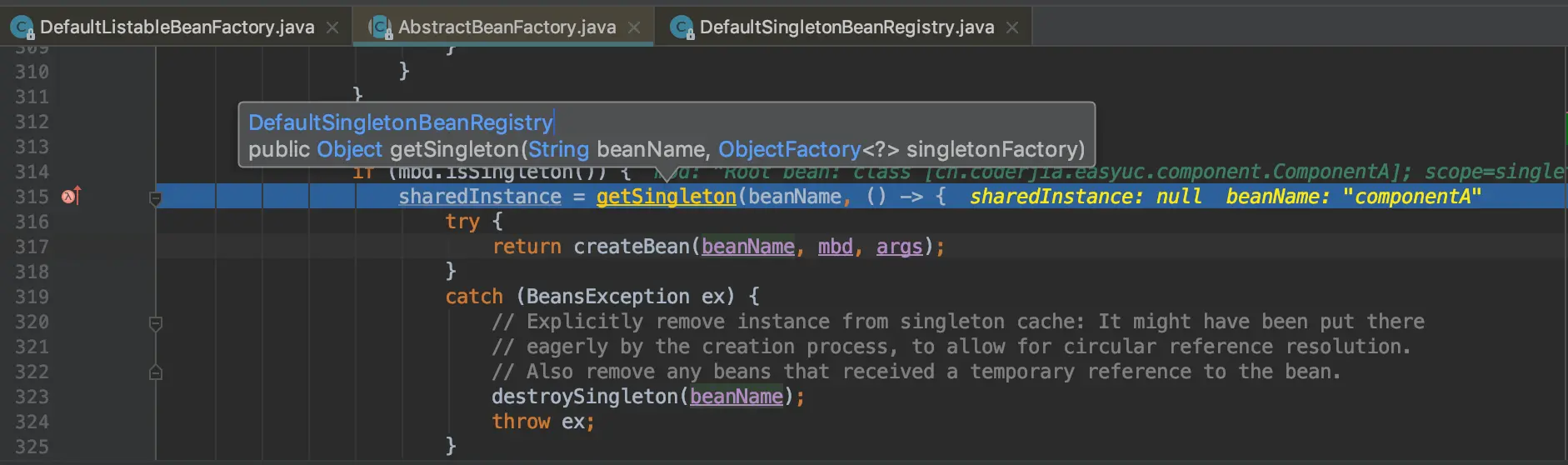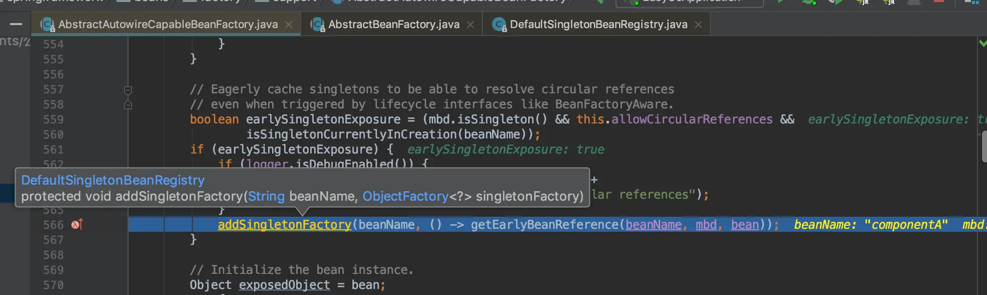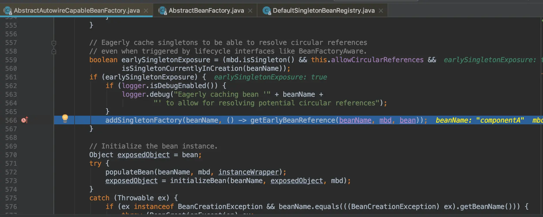 正如我们的示例代码,ComponetA依赖ComponentB,ComponentB又依赖于ComponentA,Spring中Bean的实例化Bean对象后,会对属性值注入(populate),这样就会出现如上图的循环调用过程(instantiate A->populate ComponentB->instantiateB->populate ComponentA->instantiate A)。 - 上面我们分析了什么是循环引用,接下来我们先接着跟源码。