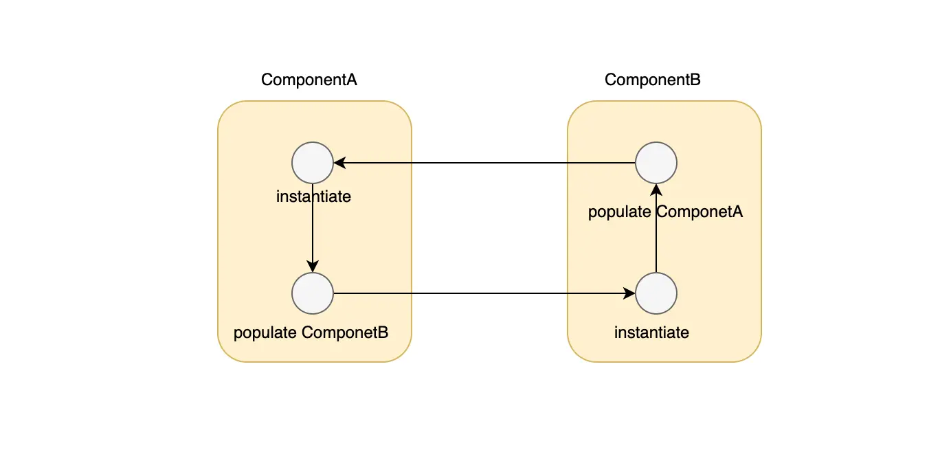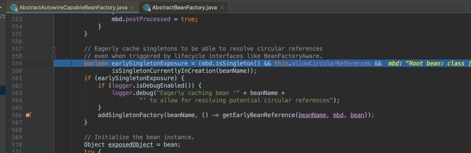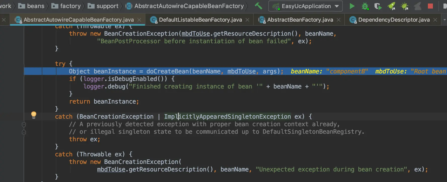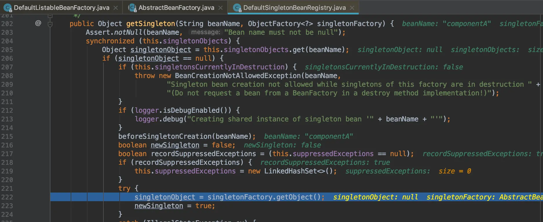 正如我们的示例代码,ComponetA依赖ComponentB,ComponentB又依赖于ComponentA,Spring中Bean的实例化Bean对象后,会对属性值注入(populate),这样就会出现如上图的循环调用过程(instantiate A->populate ComponentB->instantiateB->populate ComponentA->instantiate A)。 - 上面我们分析了什么是循环引用,接下来我们先接着跟源码。