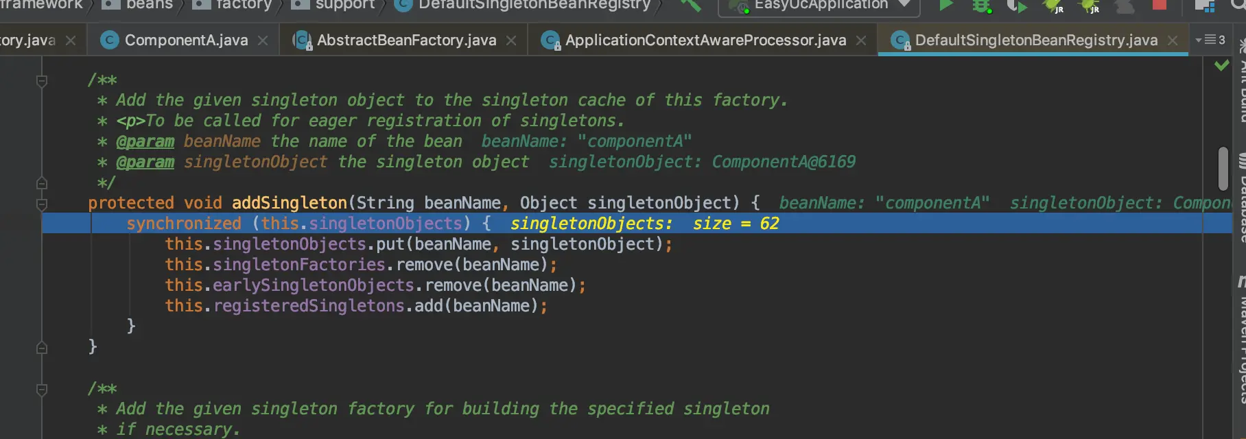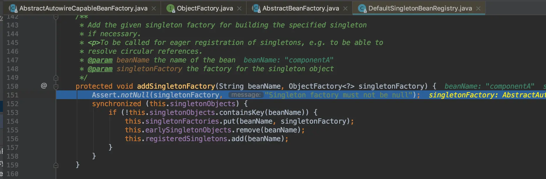 F8跟到566行 F7进入此方法,到了DefaultSingletonBeanRegistry 我们可以发现这步是将对象创建的工厂函数缓存到singletonFactories,目的为了解决循环引用的问题,那么什么是循环引用的情况与如何解决的呢?且看下文分解。
