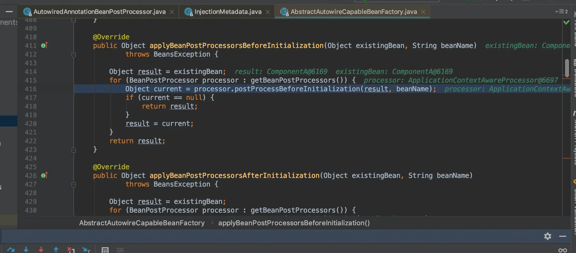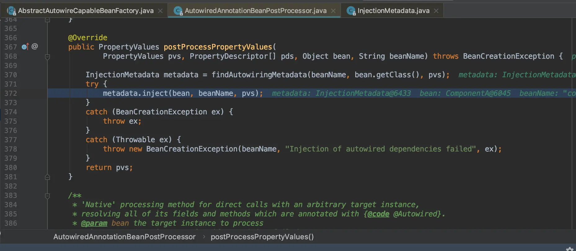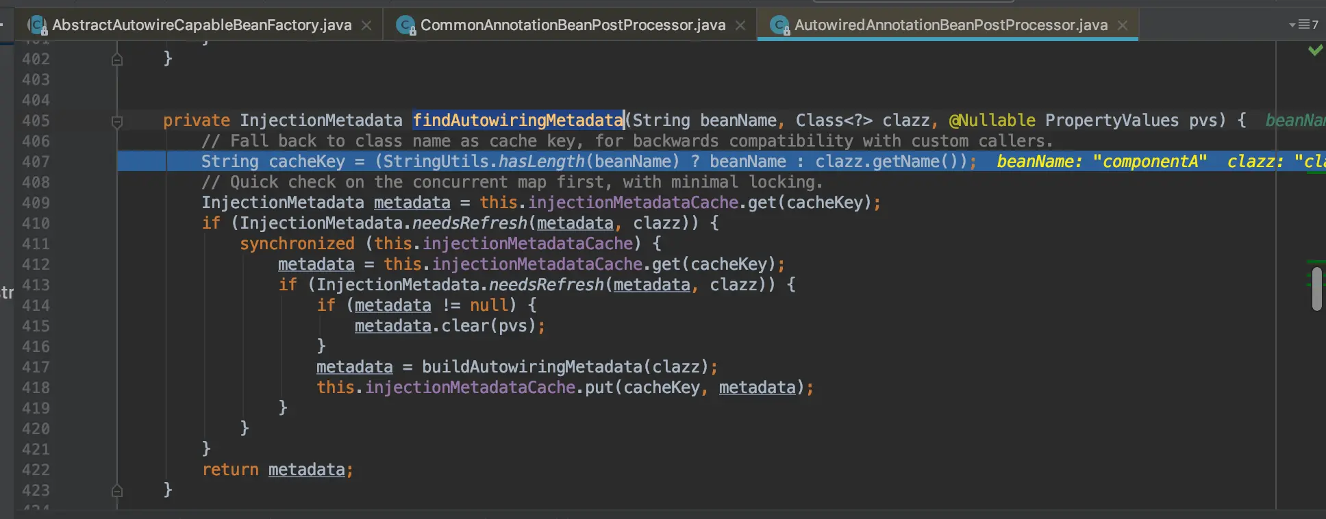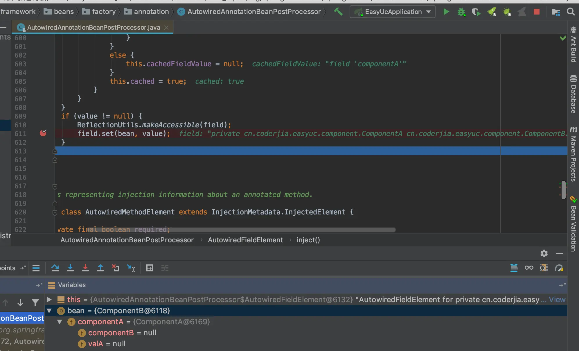F8跟到AutowiredAnnotationBeanPostProcessor的inject(611)行 这个时候就可以发现,ComponetB创建完成,注入的是预先缓存好的示例化的ComponetA - 接下仍然一直
