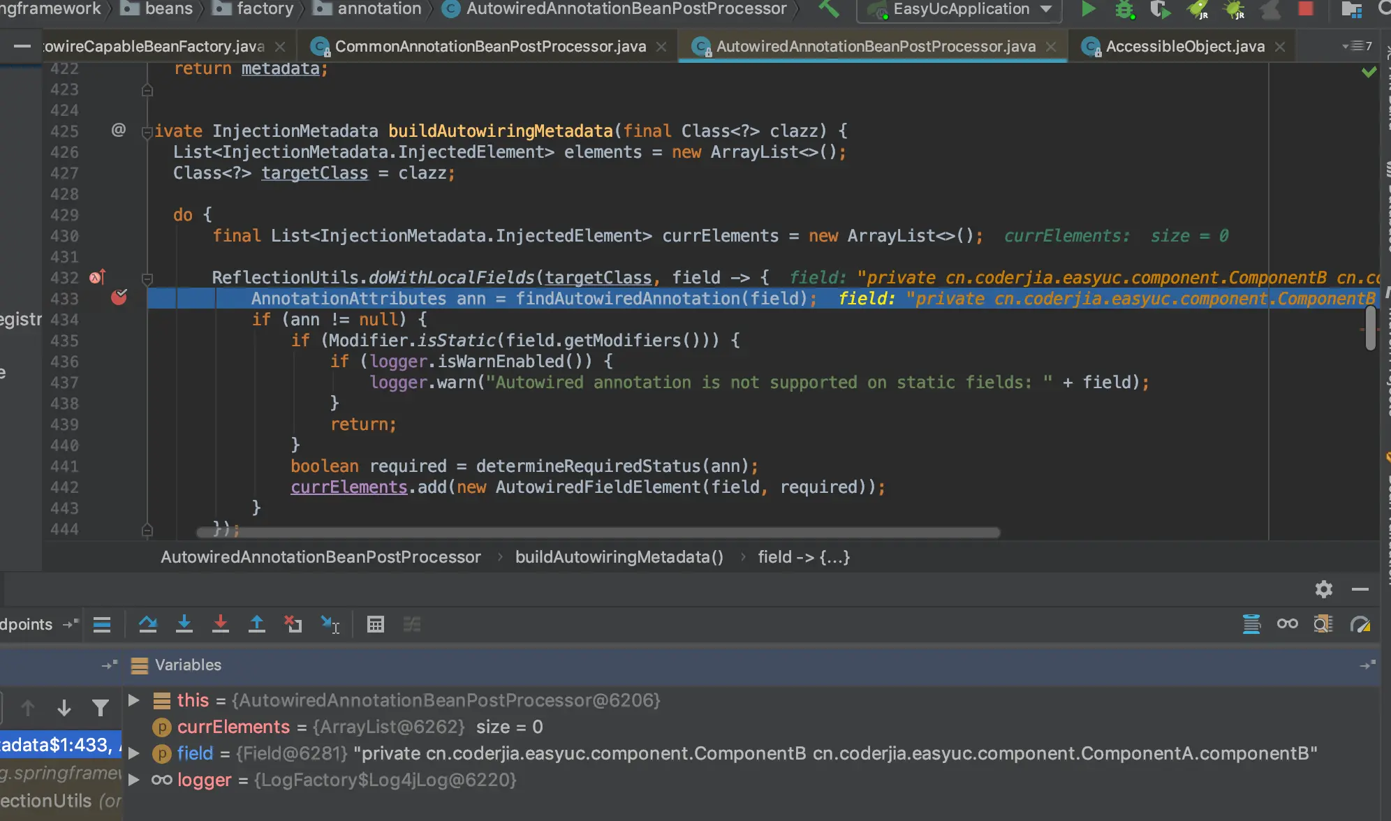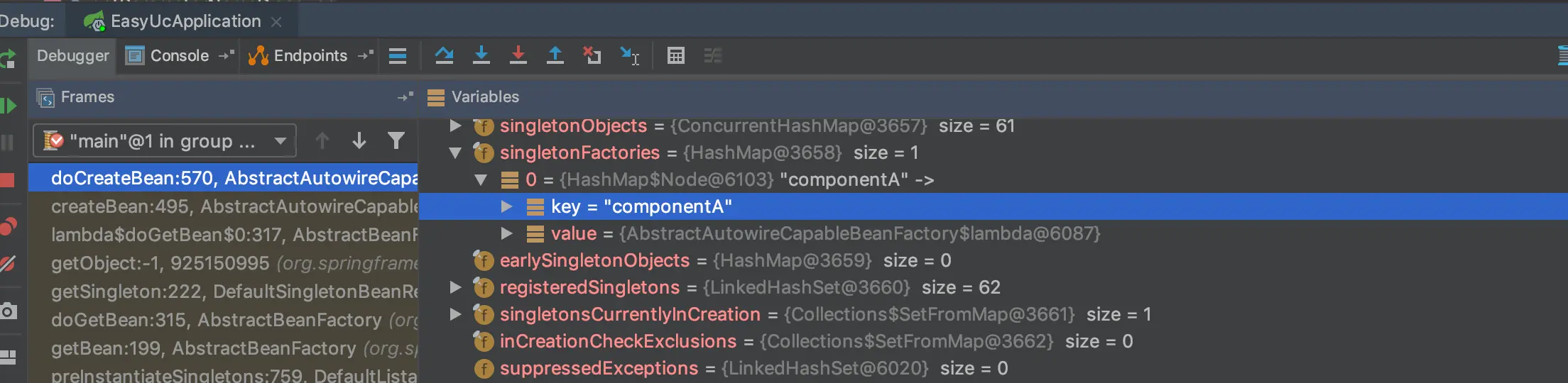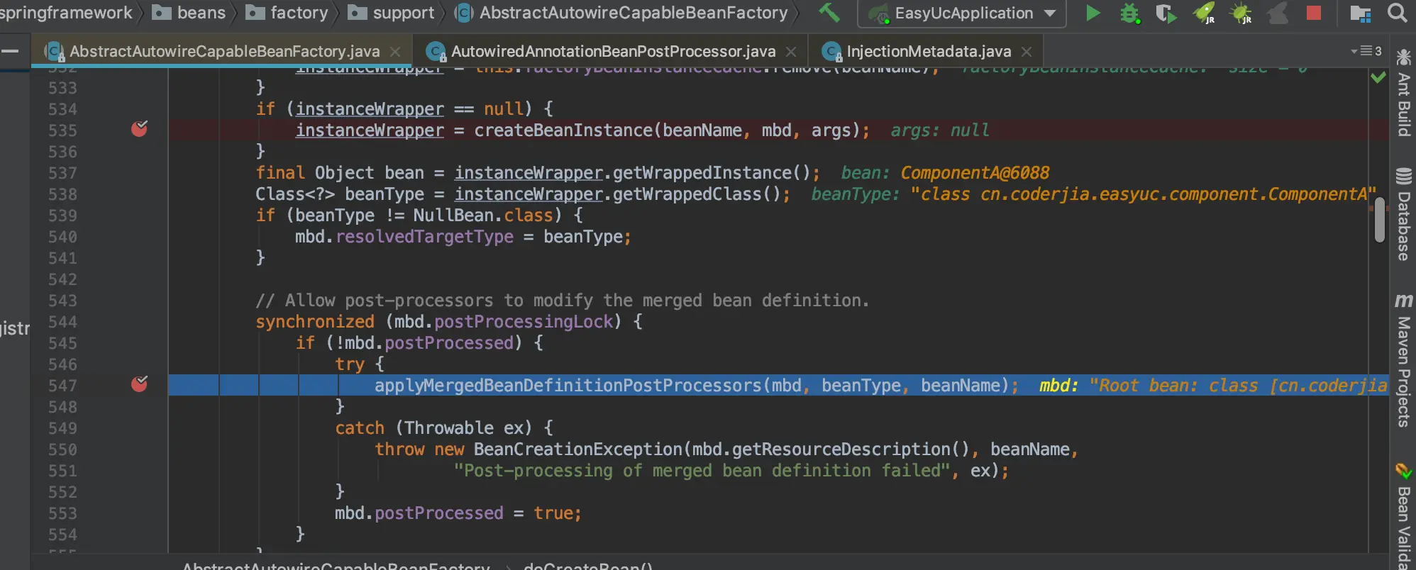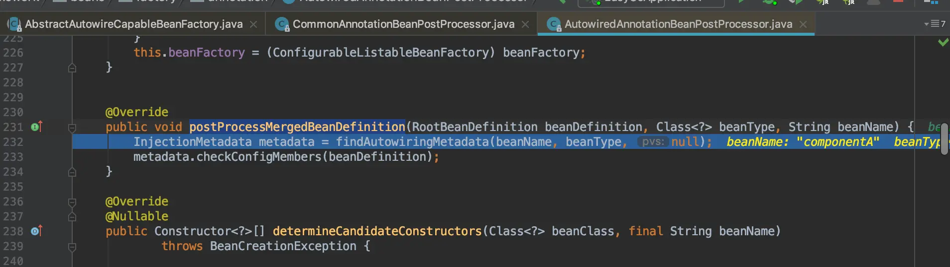 F8跟到AutowiredAnnotationBeanPostProcessor的inject(611)行 这个时候就可以发现,ComponetB创建完成,注入的是预先缓存好的示例化的ComponetA - 接下仍然一直