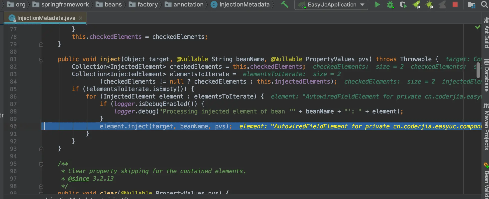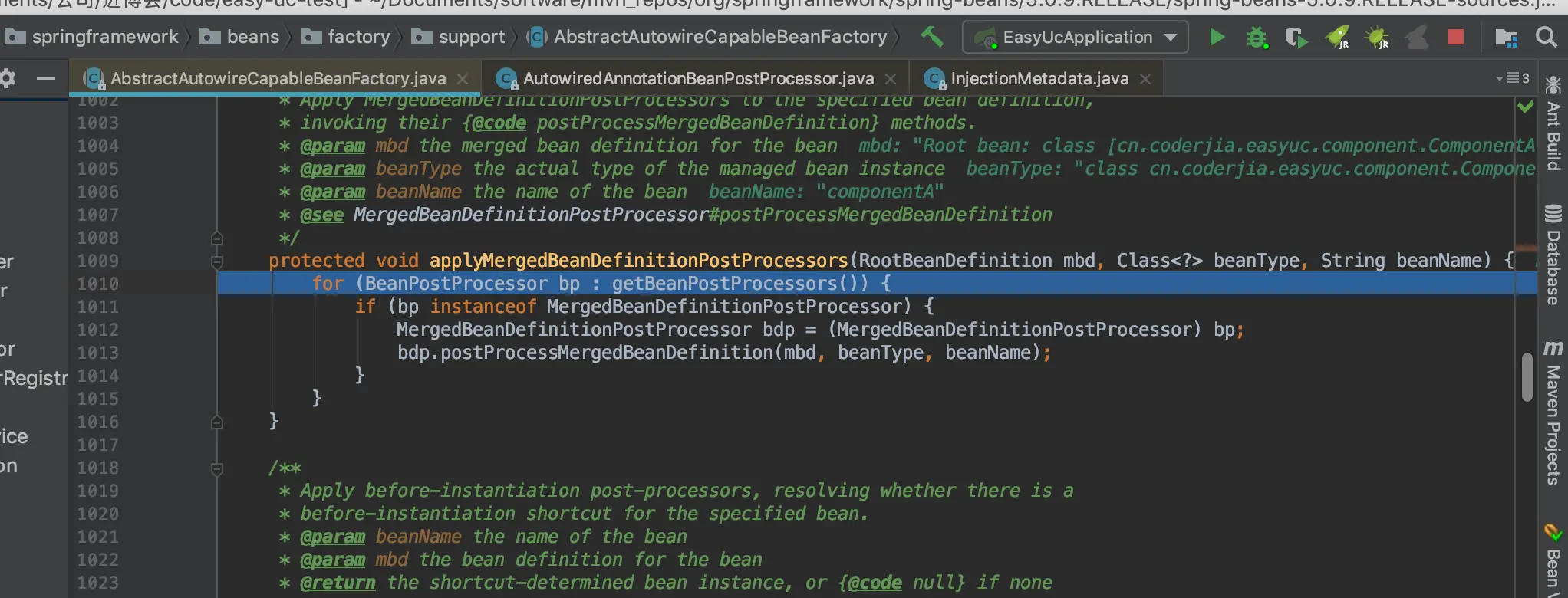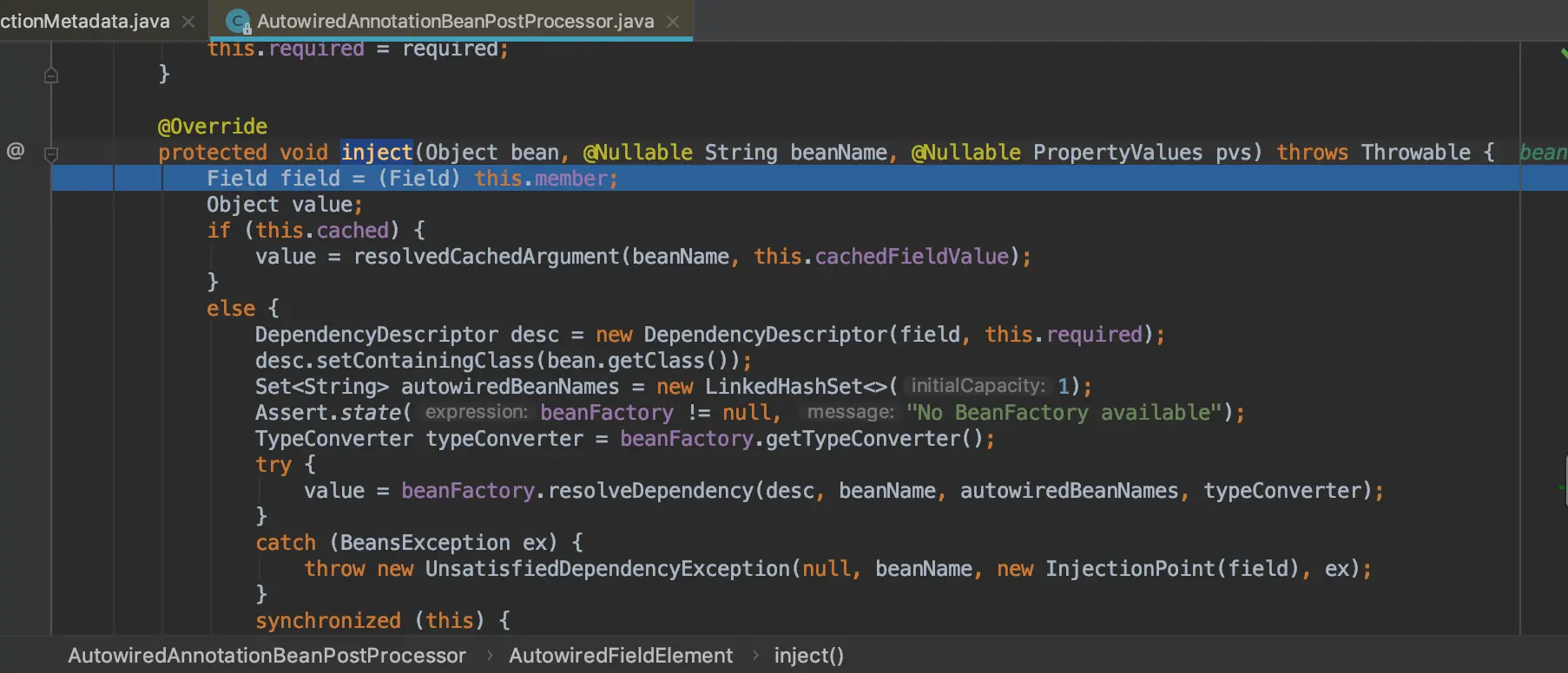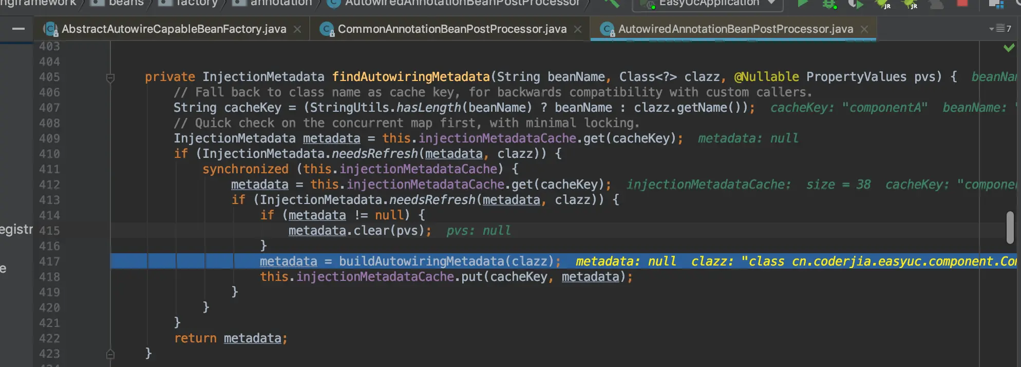 F8跟到AutowiredAnnotationBeanPostProcessor的inject(611)行 这个时候就可以发现,ComponetB创建完成,注入的是预先缓存好的示例化的ComponetA - 接下仍然一直