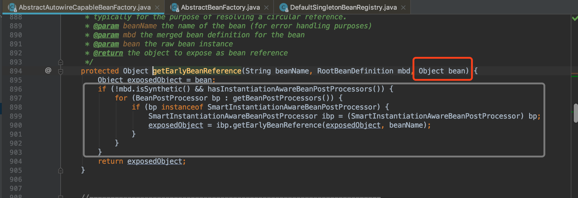 F7进入,F8跟到doCreateBean(572)行 我们现在应该很清楚的知道,我们到了解决循环依赖问题的第7步骤