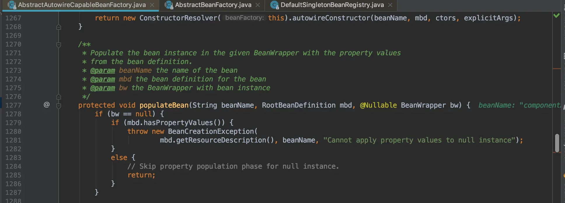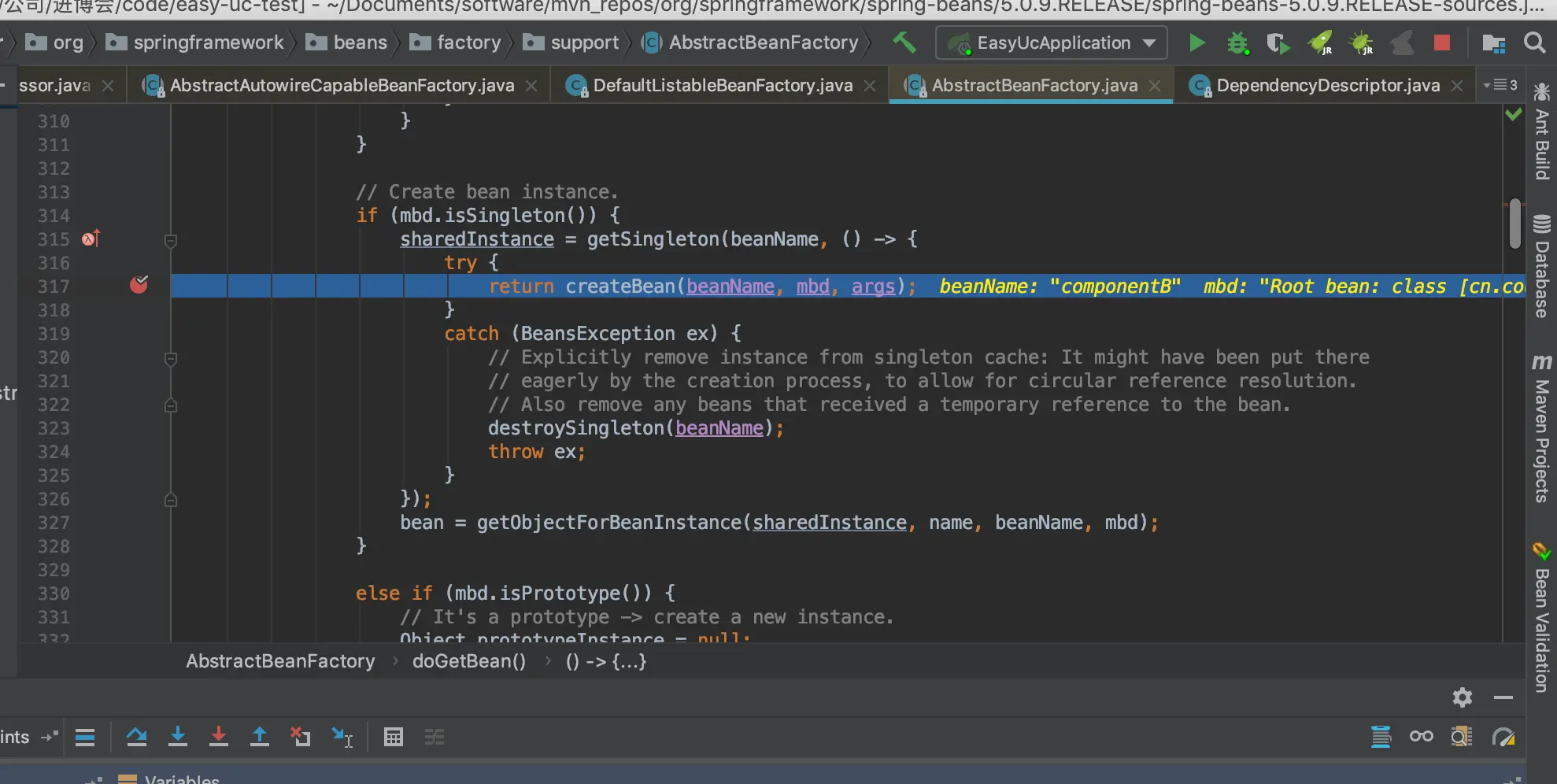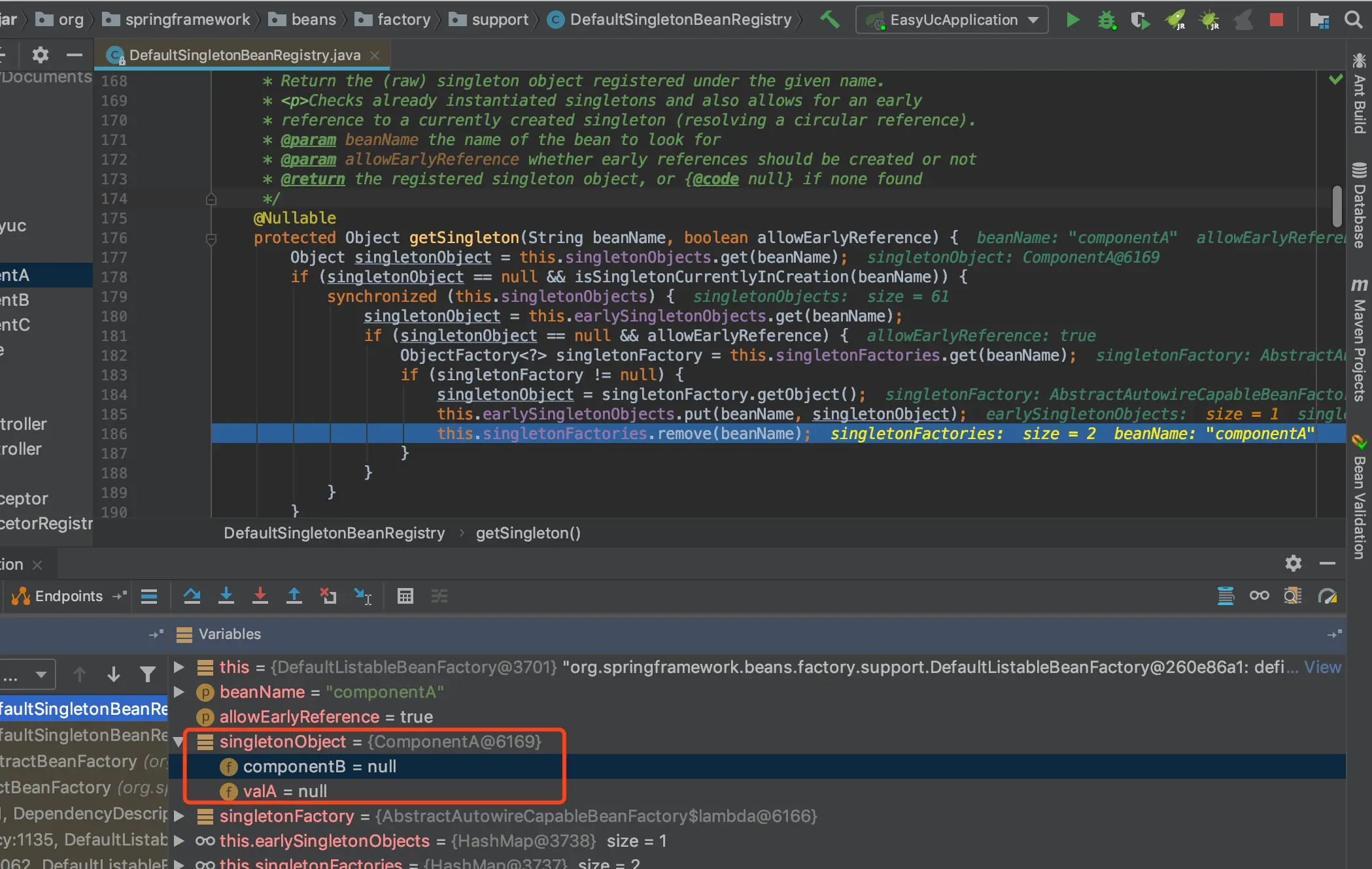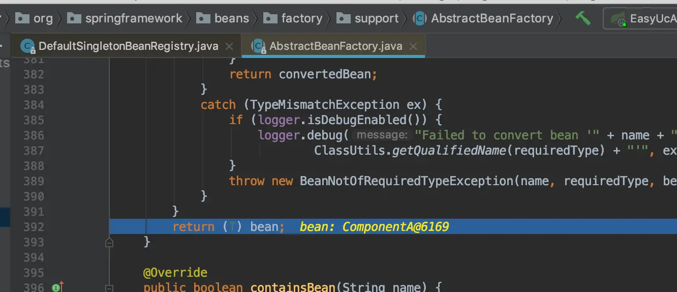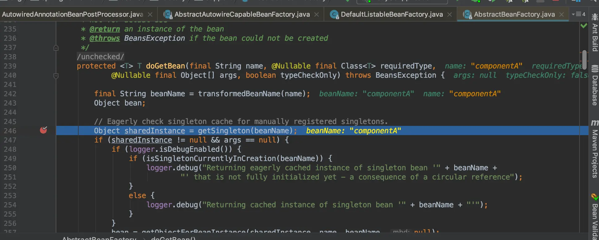 到246行,其实就是到了上面循环依赖解决方案图中第4步先从cache取出B的实例,显然没有那么就接着按图中走,第5步没有B的示例去instantiate个示例。 然后在317行打个断点,F9跳到这F7进入,F8跟到doCreateBean(495)行F7进入,F8跟到doCreateBean(572)行 我们现在应该很清楚的知道,我们到了解决循环依赖问题的第7步骤populate ComponentA,F7进入populateBean方法。populate ComponentA时,肯定最终会去试图创建ComponentA,也会回到AbstractBeanFacotry的doGetBean(239)行F7进入getSingleton(246)行,一直跟到DefaultSingletonBeanRegistry的getSingleton(176)行,F8跟到185行 我们到了解决循环依赖问题的第8步骤,从cache中取出Bean,而且这个Bean正好是我们上文书所说的那样,是实例化后的,未完成属性注入和初始化的。F8到最后doGetBean(392)行- 接下来就是一直