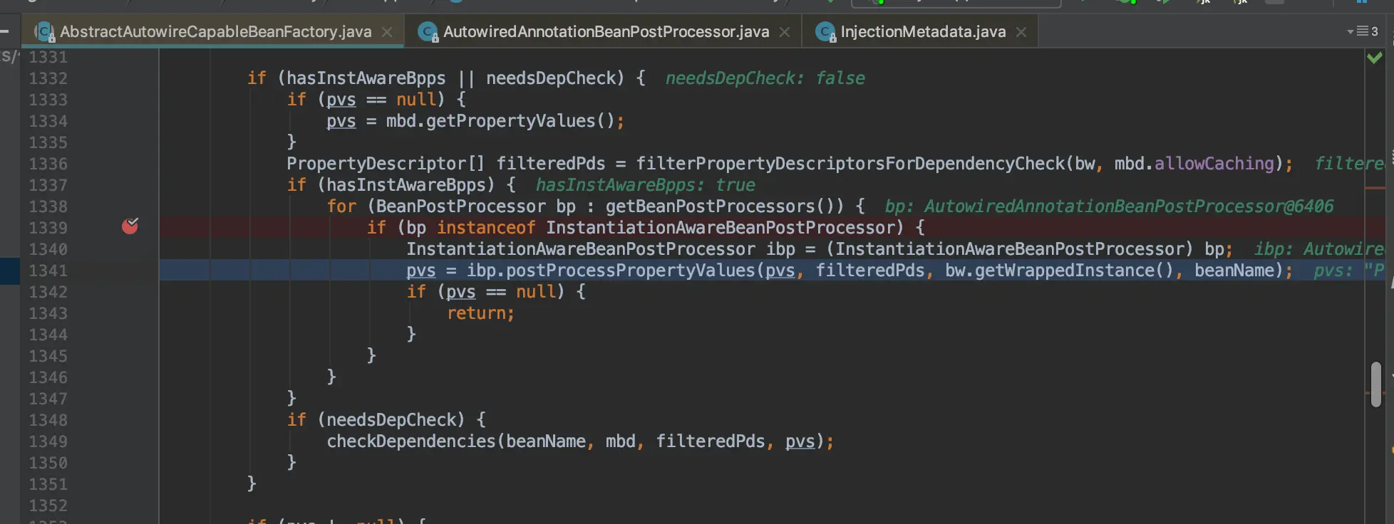 我们上回书说到,将实例化后未初始化的Bean对象工厂放置到第三级缓存中。 F7进入到getEarlyBeanReference(566) 理论上讲,两级缓存就够了,对象实例化后放到earlySingletonObjects缓存中,在需要提前引用的地方取出就可以解决循环引用的问题。但是第三级缓存存在的意义除了保存Bean外,还可以在获取的时候,对Bean可以做前置处理(InstantiationAwareBeanPostProcessor),有这样一种拓展的能力。 简单的理解就如上面图中的过程: 创建Component A后,把Component A缓存起来,注入Component B属性时,创建Component B,Component B需要注入Component A,从缓存把Component A取出来,完成Component B的创建全过程,在将Component B返回给Component A,Component A也可完成创建全过程。F8跟到populateBean(572) 按照我们上面的解释,这步是会去注入Componet B,然后自然而然需要创建Componet B。接下来看下是不是这样。F7进入此方法,到了AbstractAutowireCapableBeanFactory的populateBean(1277)行F8一直往下跟1339行打个断点,然后一直F9跳到bp为AutowiredAnnotationBeanPostProcessor时候停止,F8跟到 1341行F7进入此方法,来到CommonAnnotationBeanPostProcessor的metadata.inject(318)行F7进入此方法,来到InjectionMetadata的inject(81) 写到这我们发现需要注入的属性componetB和valA已经在checkoutedElements中,要对其进行值的注入。可以发现@Autowired和@Value值就是在这阶段对其赋值的。那么componetB和valA什么时候加到checkoutedElements中的呢?- 先回退下,找到