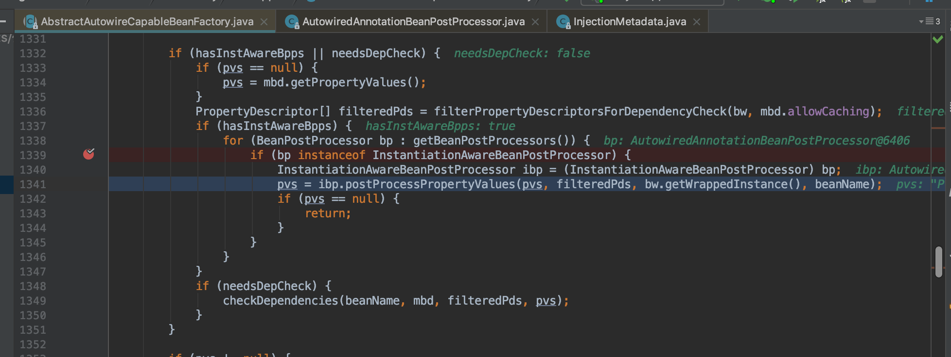 F8一直往下跟1339行打个断点,然后一直F9跳到bp为AutowiredAnnotationBeanPostProcessor时候停止,F8跟到 1341行