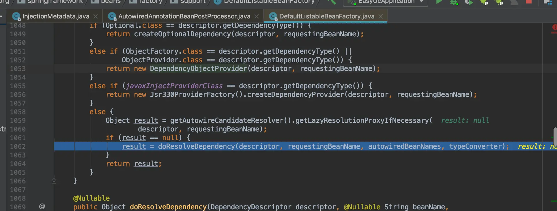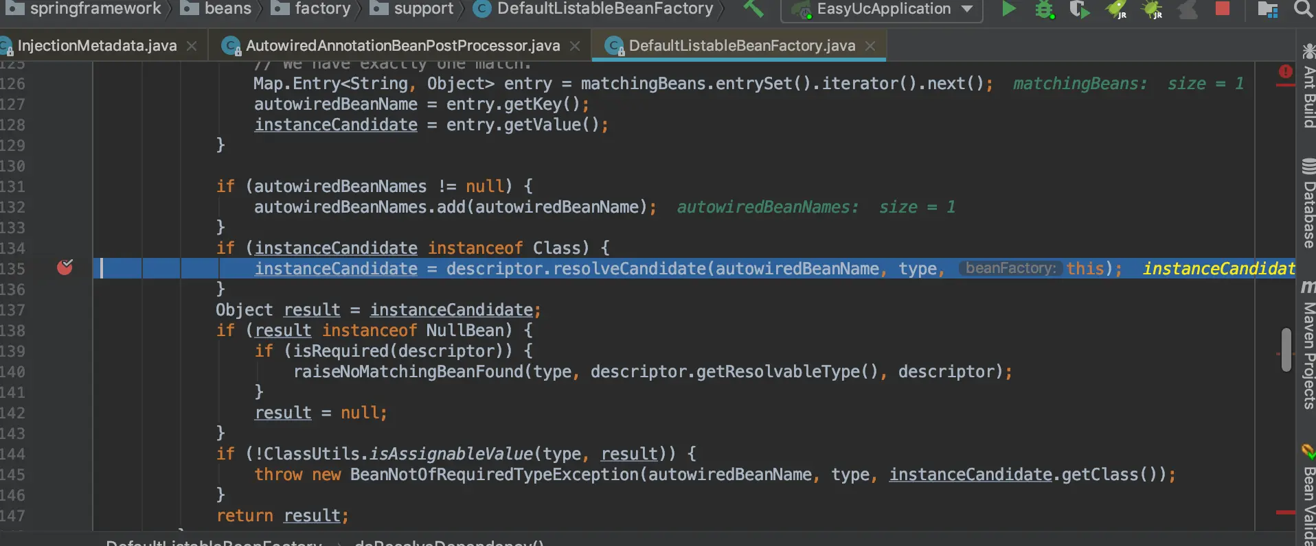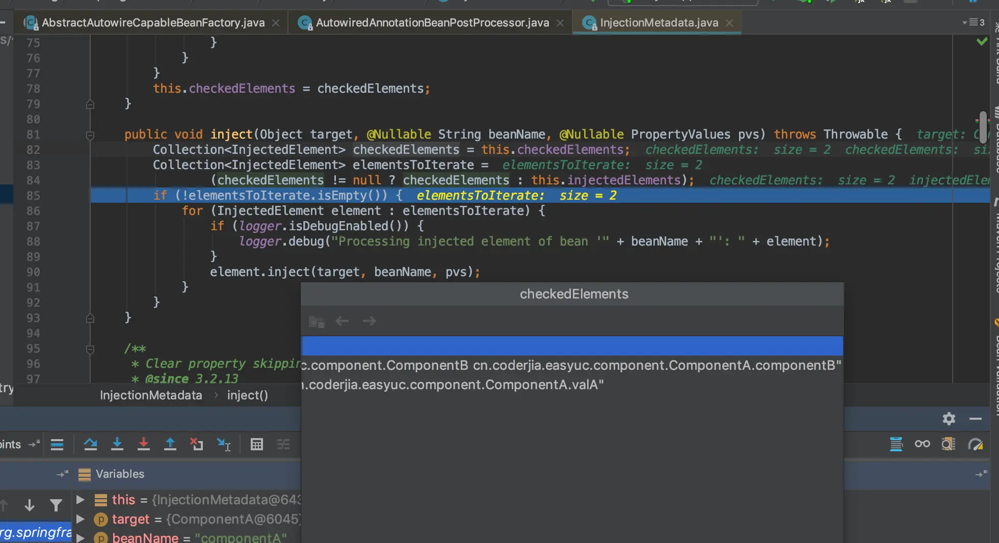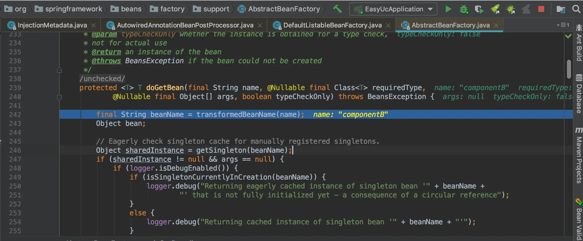 InjectionMetadata的inject(81),接着分析注入的过程 通过上面分析我们知道elementsToIterate一共有两个属性需要注入,分别是ComponetB或者valA F7进入InjectionMetadata的inject(90)行,来到AutowiredAnnotationBeanPostProcessor的inject(570)行F8跟到583行,F7进入beanFactory.resolveDependency(583)行,来到了DefaultListableBeanFacotory的doResolveDependency(1062)行F7进入doResolveDependency(1062),来到DefaultListableBeanFacotory的1069行,接着在1135行打个断点,F9跳到此位置 我们知道当前需要注入的一个属性是ComponetB是个类,所以会走这进行初始化F7进入descriptor.resolveCandidate(1135)行,来到DependencyDescriptor的resolveCandidate(248)行F7进入beanFactory.getBean(251)行,一直跟到AbstractBeanFacotory的doGetBean(239)行,以下过程都是创建Componet B的过程,所以聚集在一起,等Componet B中需要注入Component A时我们在分开。