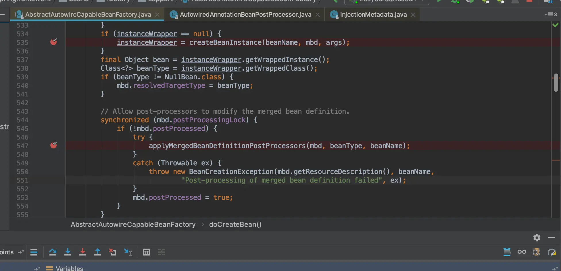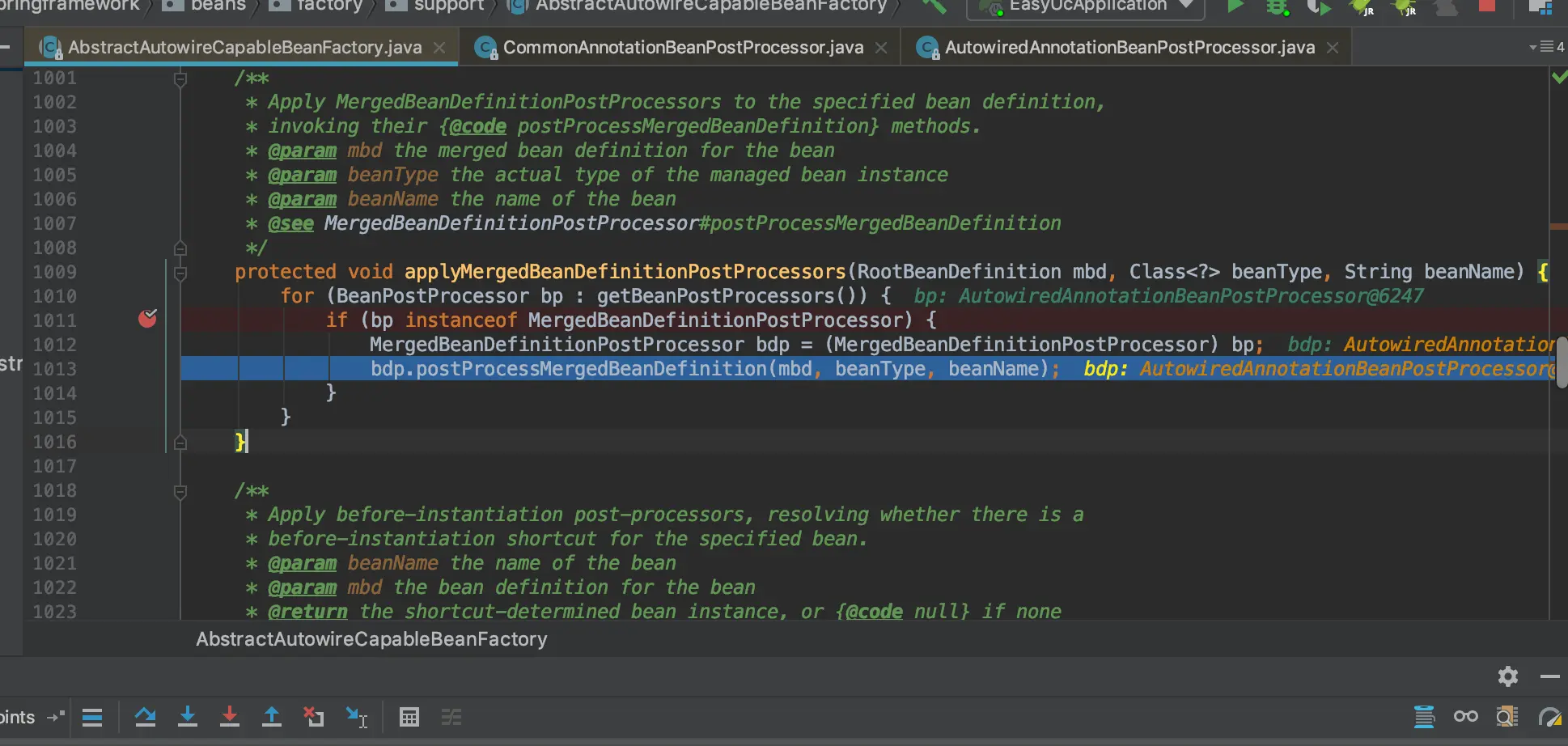 AbstractAutowireCapableBeanFactory的applyMergedBeanDefinitionPostPorcessors(547)行,打个断点 - 重新启动容器,