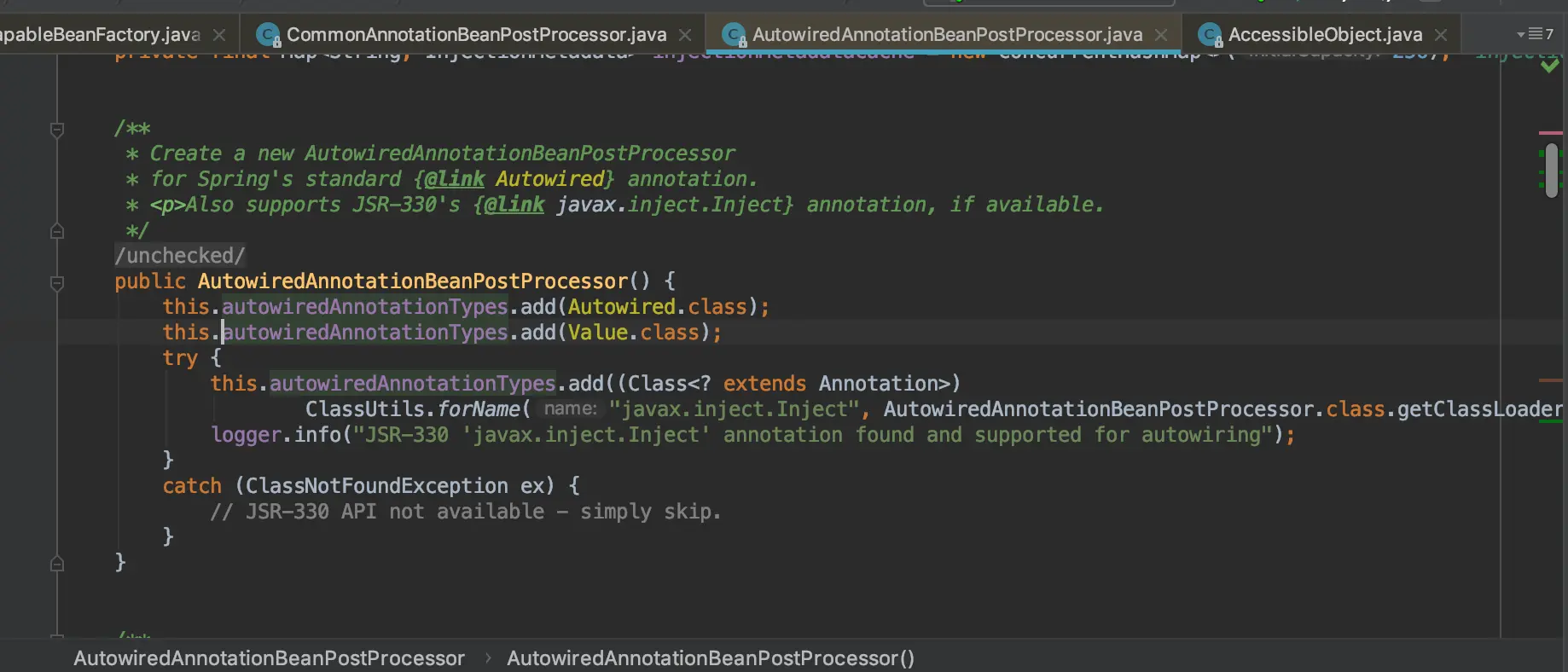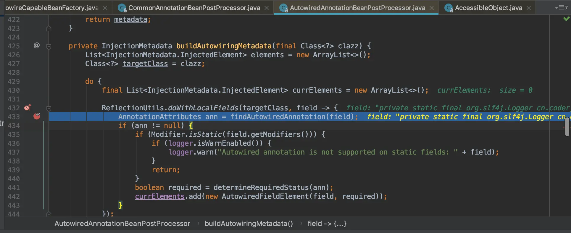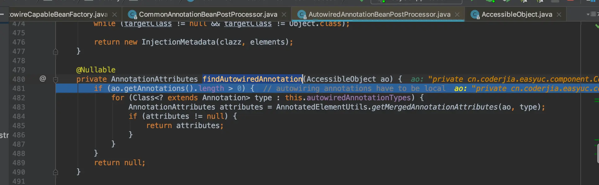 F9一直跳到ComponetA F7跟进,进入到AbstractAutowireCapableBeanFactory的applyMergedBeanDefinitionPostPorcessors(1009)行1011行打个断点,然后F9一直跳到bp为AutowiredAnnotationBeanPostProcessorF7进入AutowiredAnnotationBeanPostProcessor的postProcessMergedBeanDefinition(231)行F8跟到232行,F7进入此方法,来到了AutowiredAnnotationBeanPostProcessor的findAutowiringMetadata(405)行F8跟到AutowiredAnnotationBeanPostProcessor的buildAutowiringMetadata(417)行F7进入此方法,来到了AutowiredAnnotationBeanPostProcessor的buildAutowiringMetadata(425)行,然后在433行打个断点F9一直跳到ComponetB或者valAF7进入此方法,来到了AutowiredAnnotationBeanPostProcessor的findAutowiredAnnotation(480)行 跟到这我们明白了,获取到当前对象的所有field,然后找看看有没有我们“感兴趣”的field,“感兴趣”的注解是提前定义好的,放在autowiredAnnotationTypes中。autowiredAnnotationTypes中都有哪些注解,我们找到AutowiredAnnotationBeanPostProcessor的构造方法。 我们可以看到“感兴趣”的注解有@Autowired、@Value、@Inject,所以ComponetB或者valA会最终被放置到checkedElements中。- 接下来我们回到