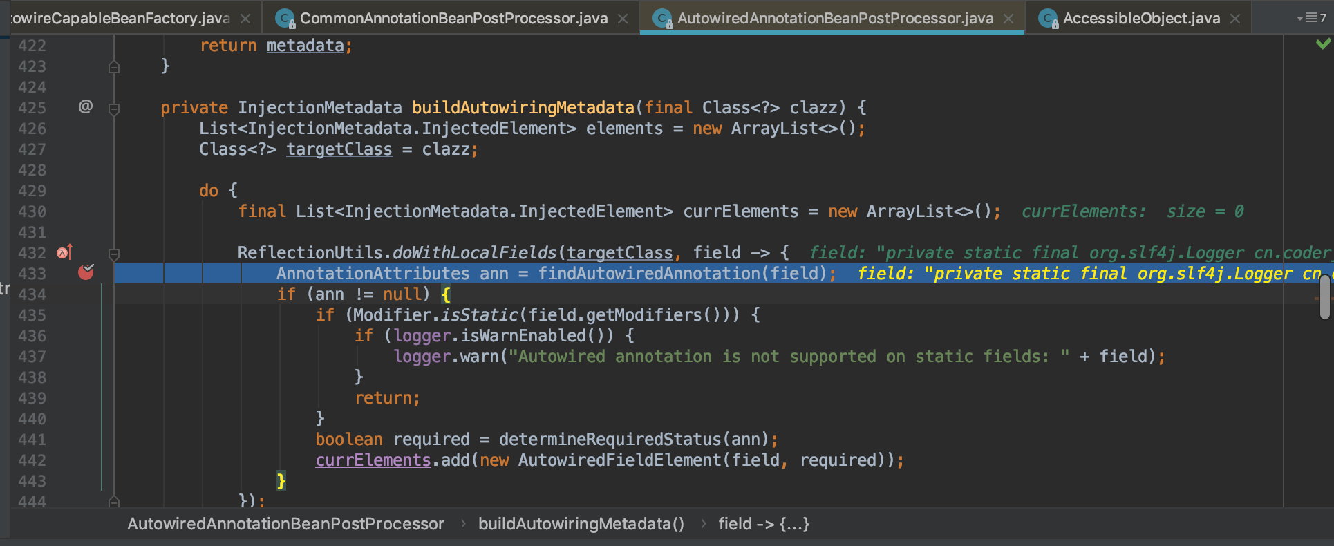 F7进入此方法,来到了AutowiredAnnotationBeanPostProcessor的buildAutowiringMetadata(425)行,然后在433行打个断点