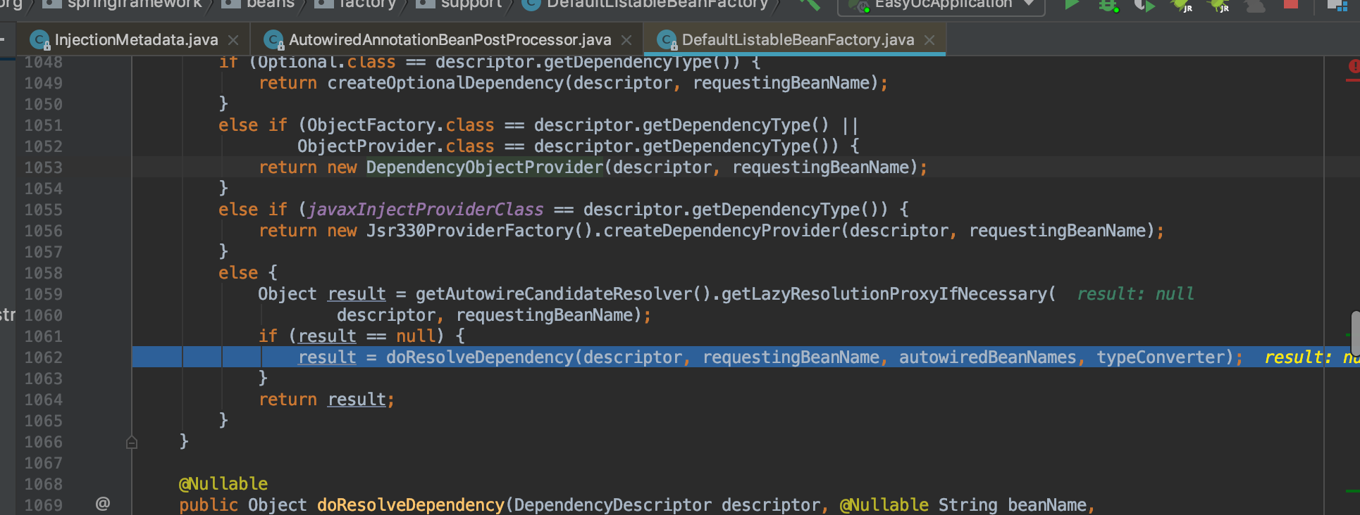 F8跟到583行,F7进入beanFactory.resolveDependency(583)行,来到了DefaultListableBeanFacotory的doResolveDependency(1062)行
