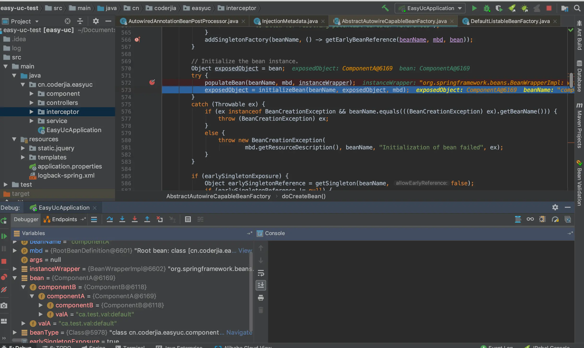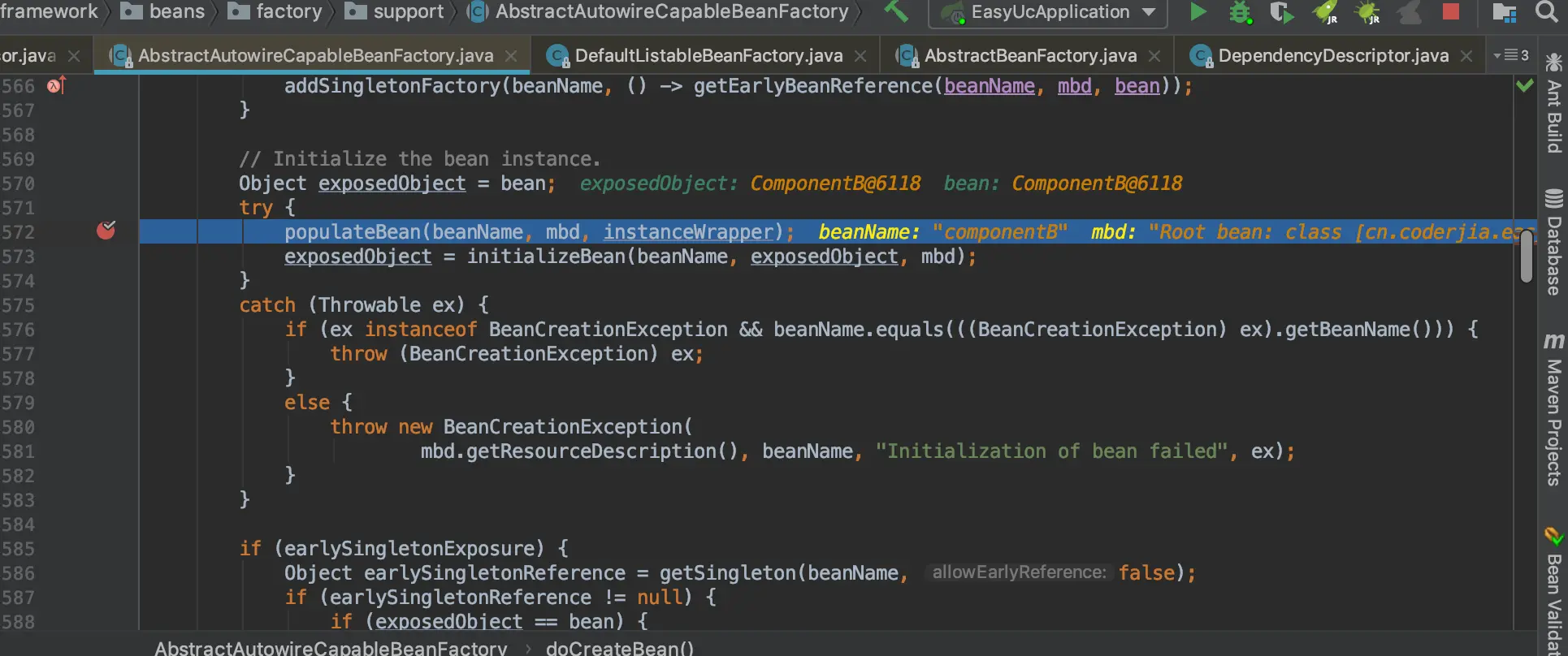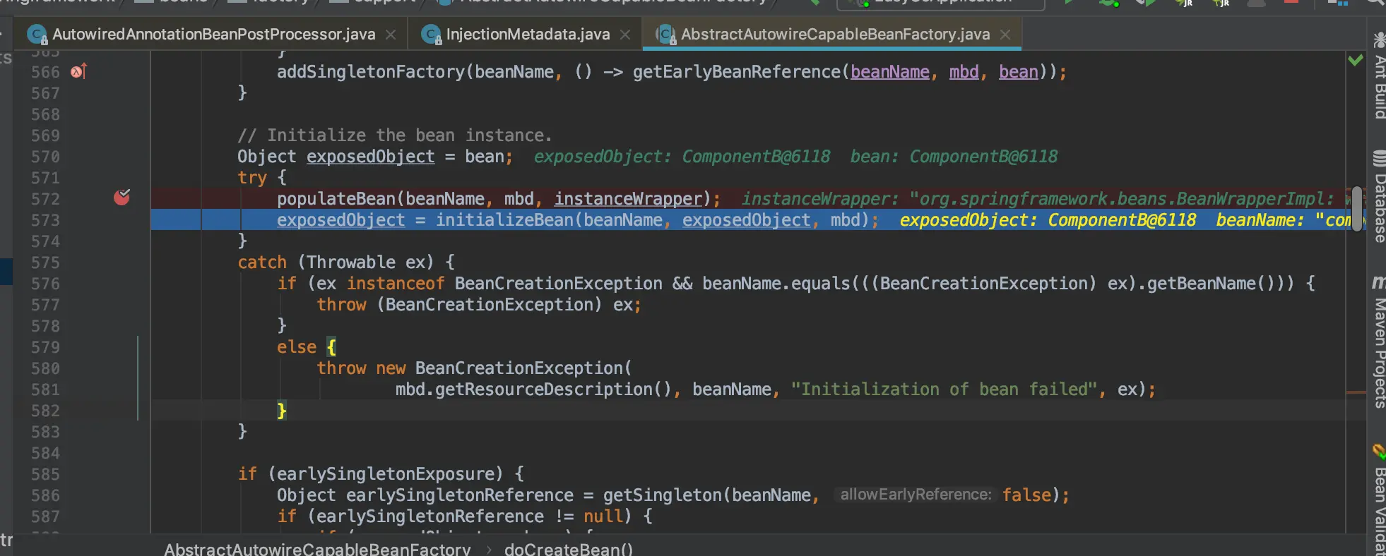 F8跟回到AbstractAutowireCapableBeanFacotry的doCreateBean(573)行 到这可以知道,ComponetB对于ComponetA已经注入完成,573行是执行ComponetB初始化操作,我们主要看ComponetA的生命周期,所以可以直接F9跳过后面过程回到ComponetA的populateBean F9跳回到ComponetA的populateBean 至此Component A彻底完成初始化和属性注入的过程,而且控制台没有任何输出也符合我们生命周期图的预测。