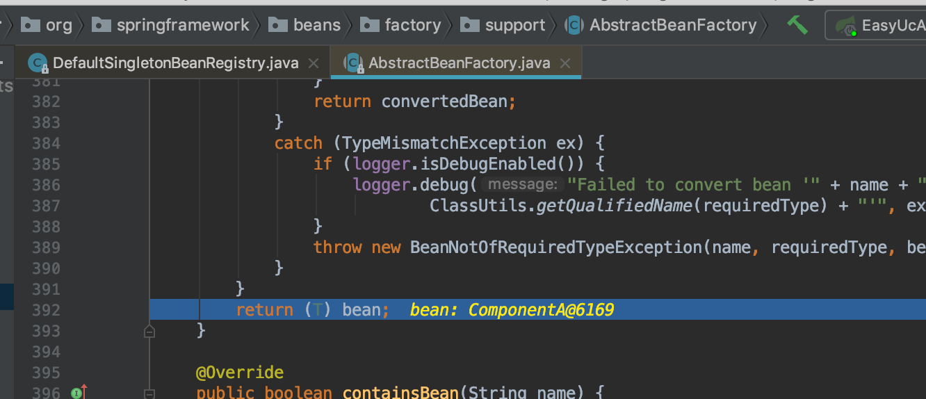 cache中取出Bean,而且这个Bean正好是我们上文书所说的那样,是实例化后的,未完成属性注入和初始化的。F8到最后doGetBean(392)行