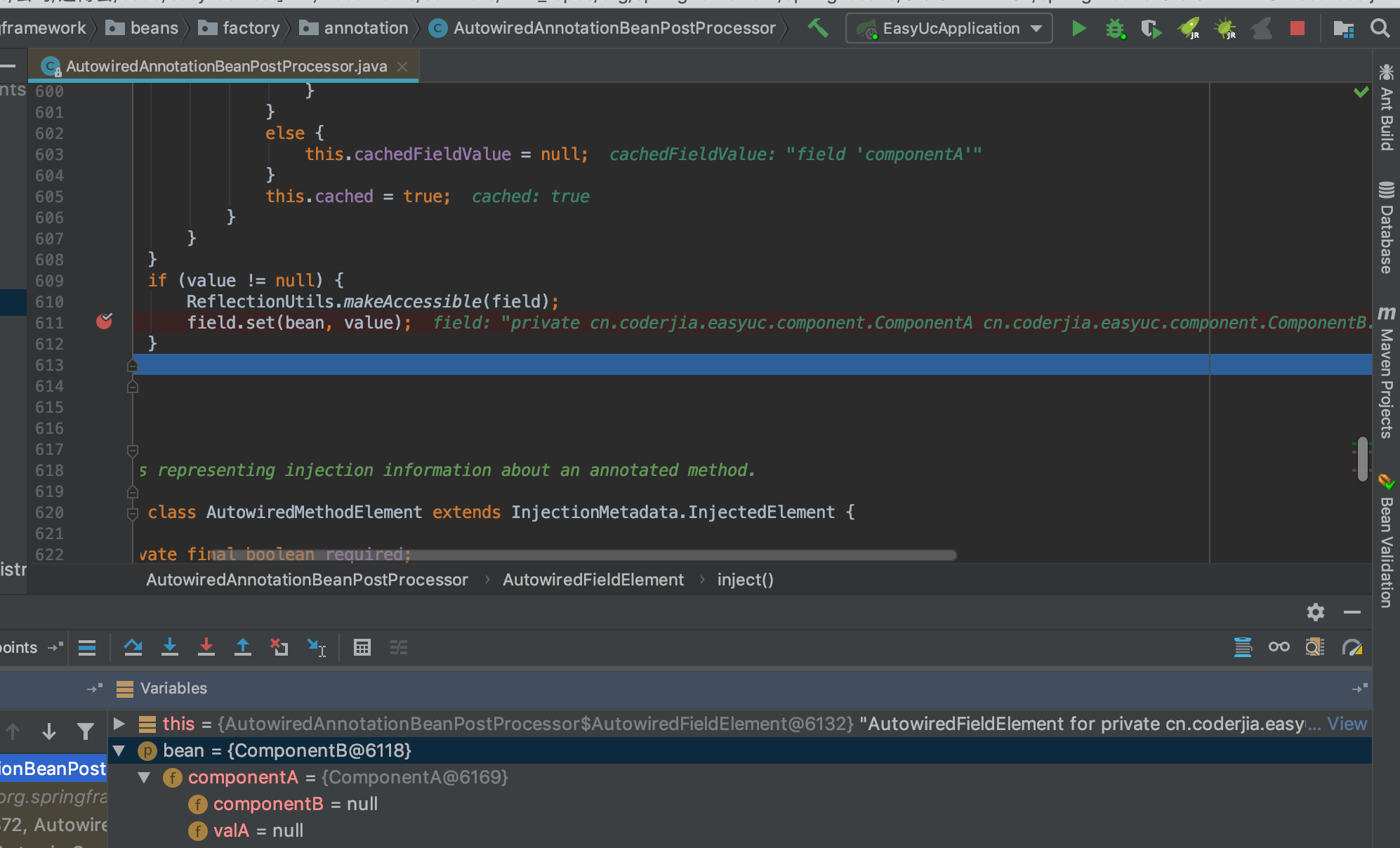 componetB和valA已经在checkoutedElements中,要对其进行值的注入。可以发现@Autowired和@Value值就是在这阶段对其赋值的。那么componetB和valA什么时候加到checkoutedElements中的呢?- 先回退下,找到