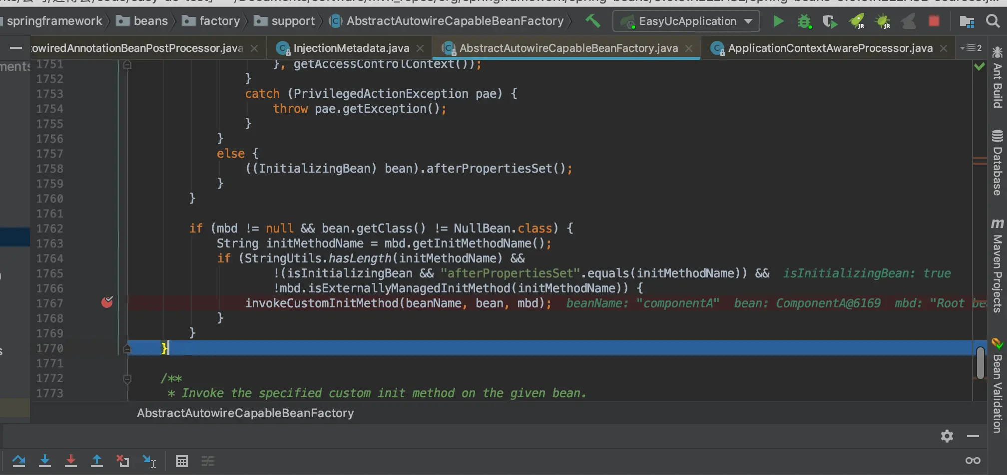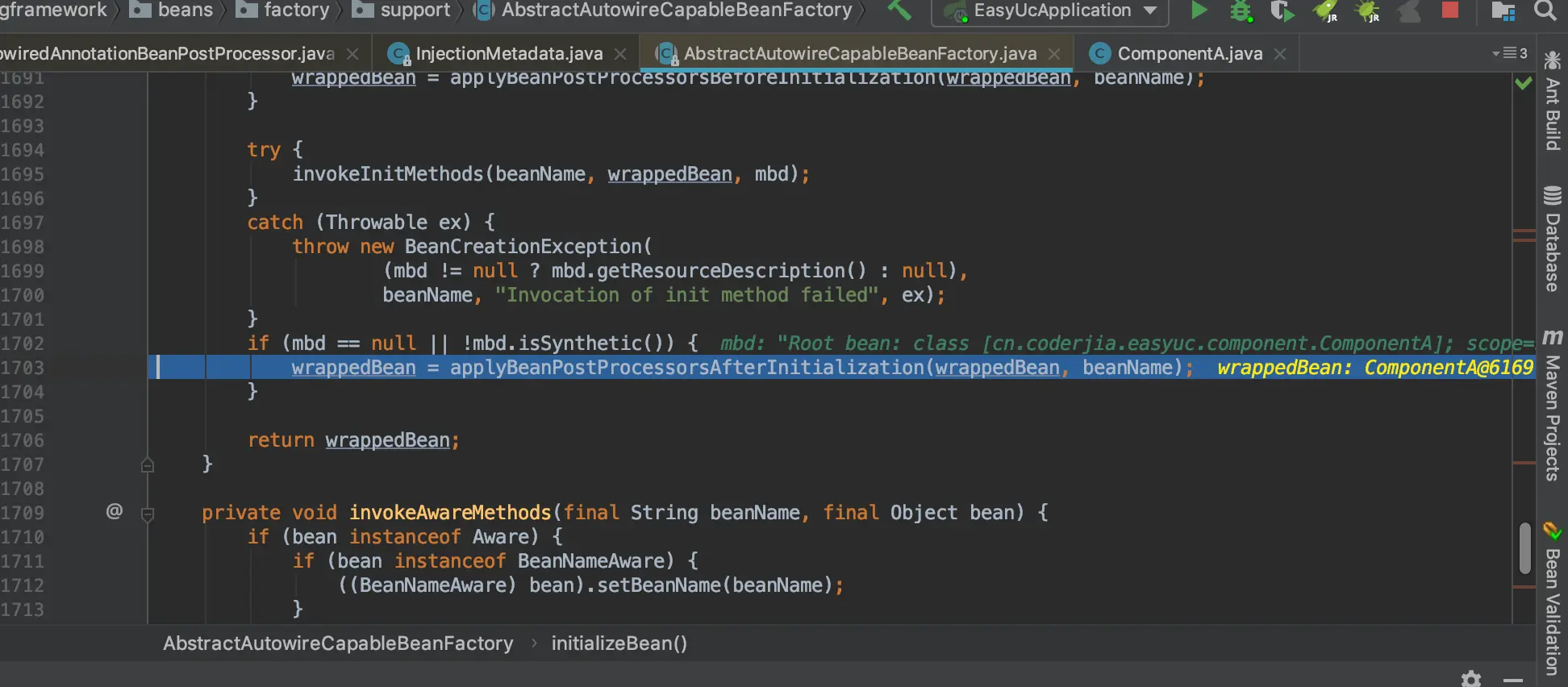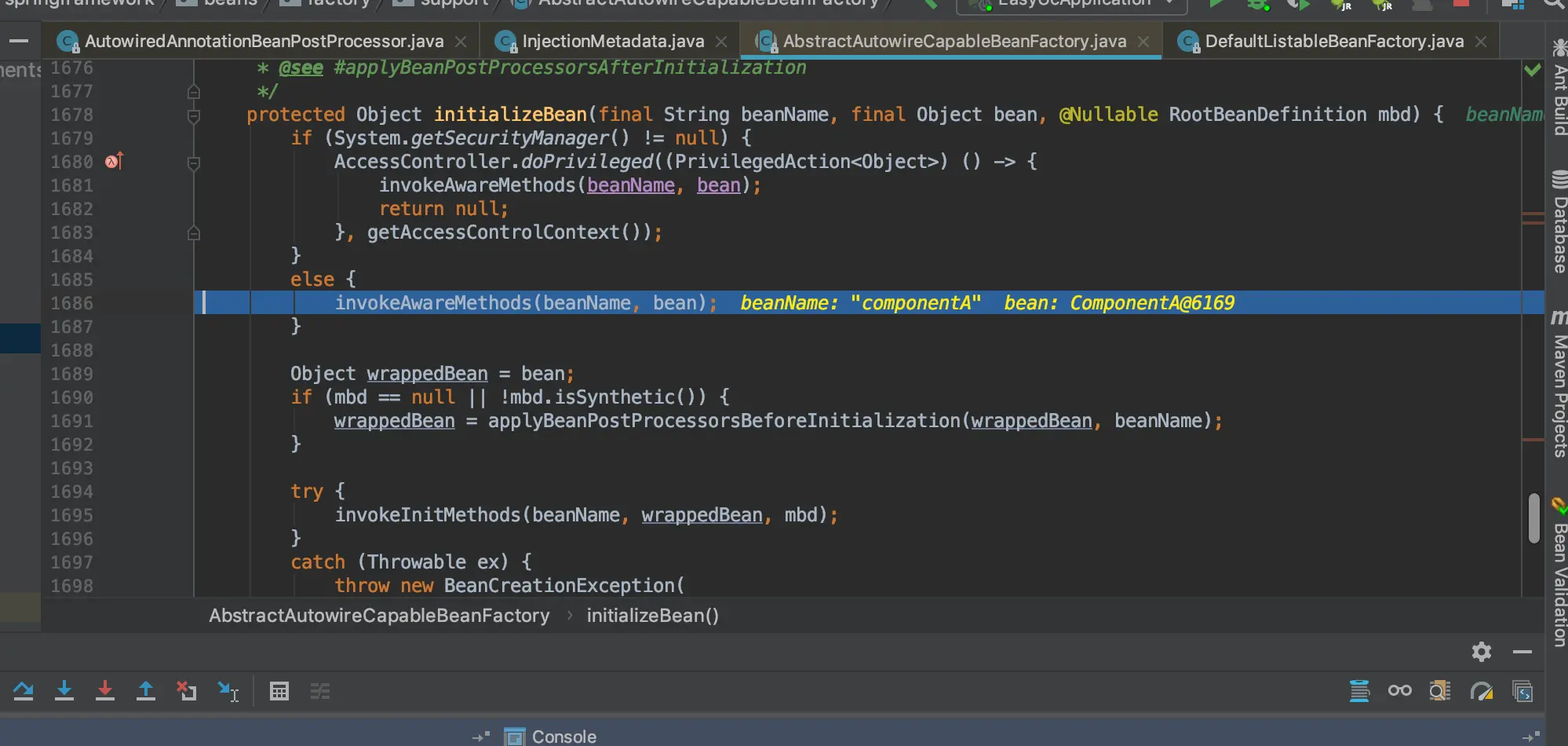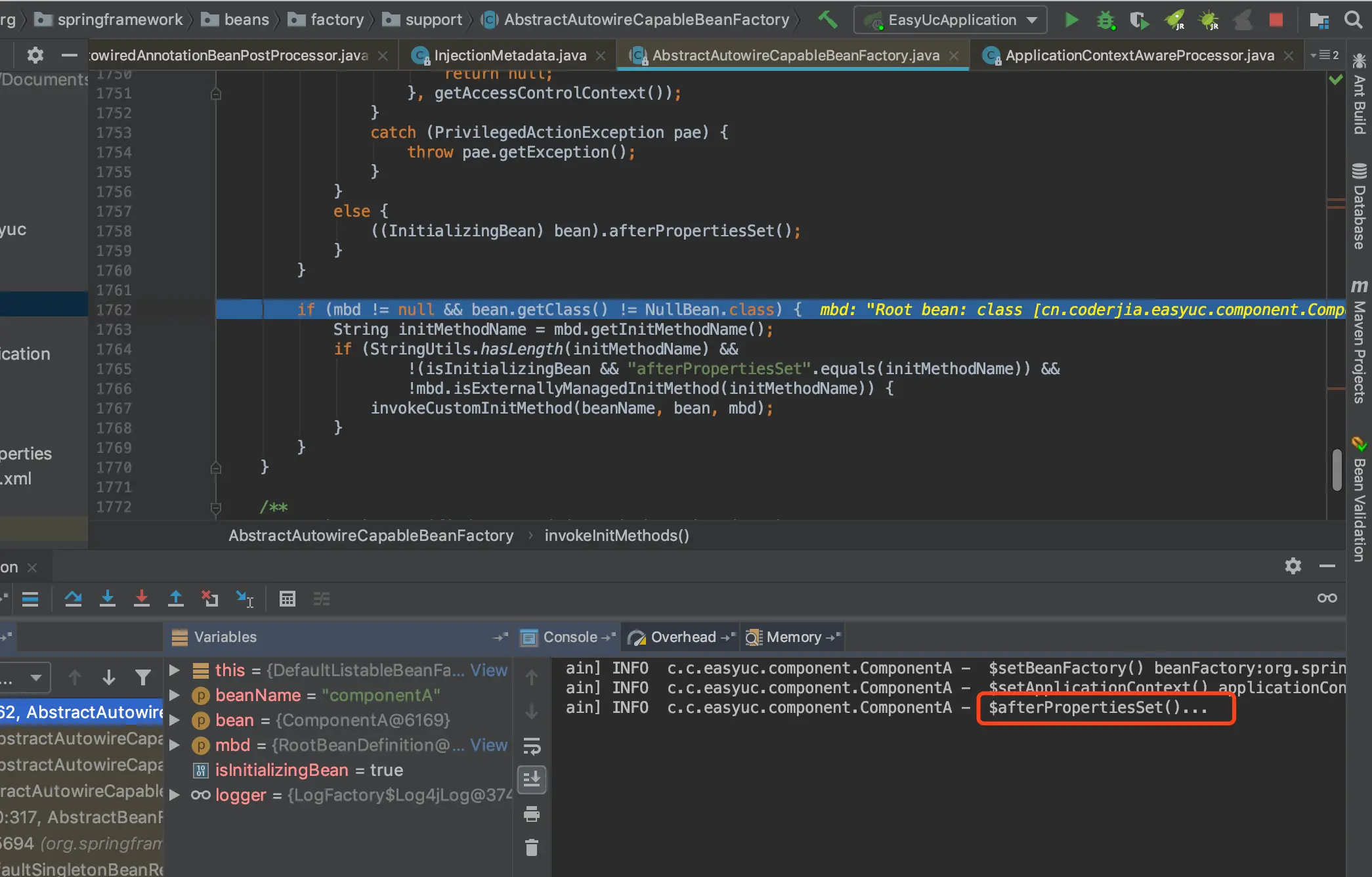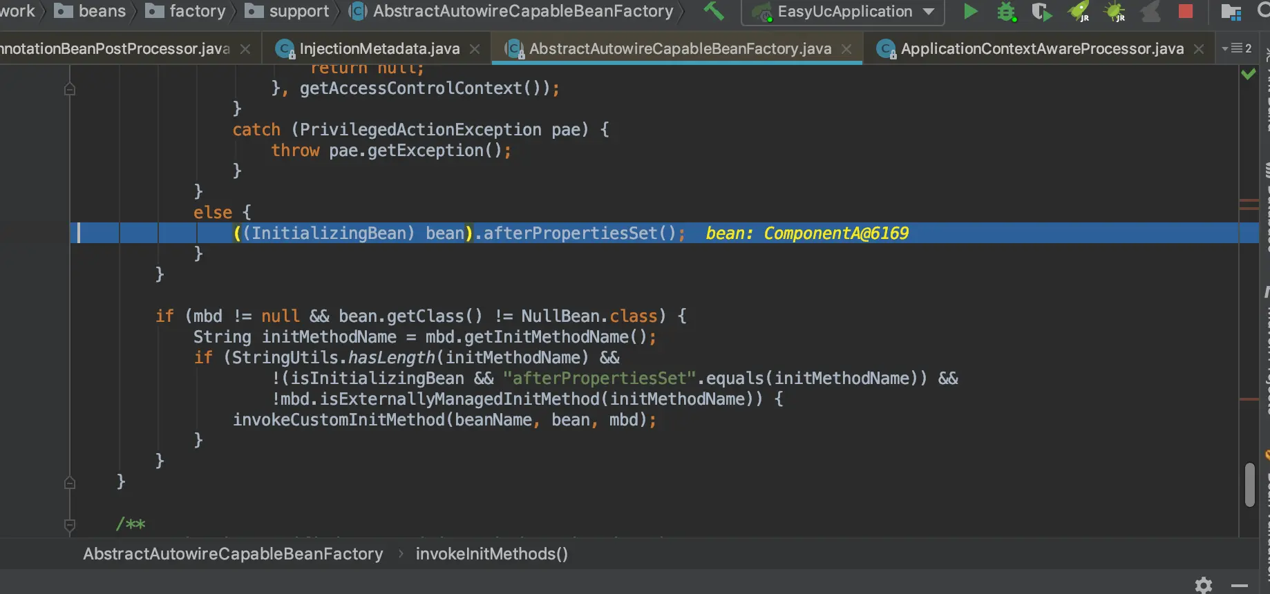 AbstractAutowireCapableBeanFacotry的initializeBean(1678)中的invokeInitMethods(1695)行,F7进入此方法,再F8跟到invokeInitMethods(1758)行F8执行afterPropertiesSet,因为ComponentA implements InitializingBean,所以控制台肯定会打印$afterPropertiesSet()...,如下图所示: