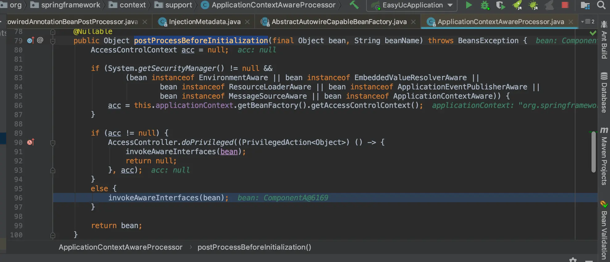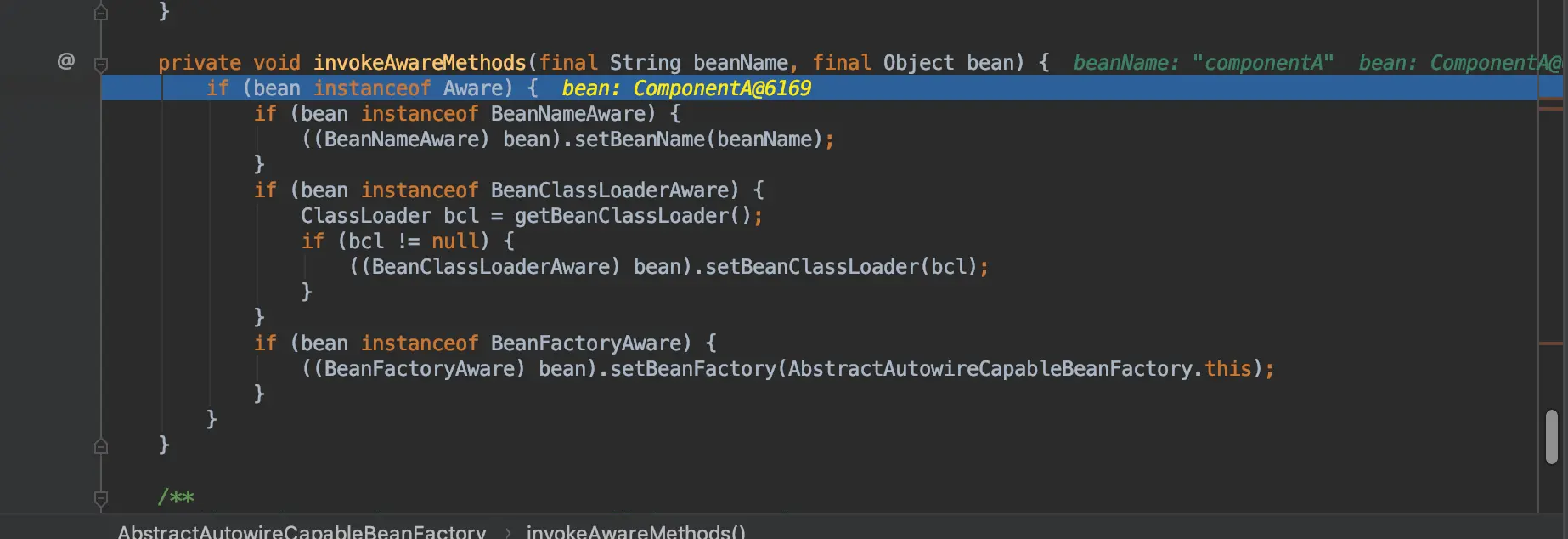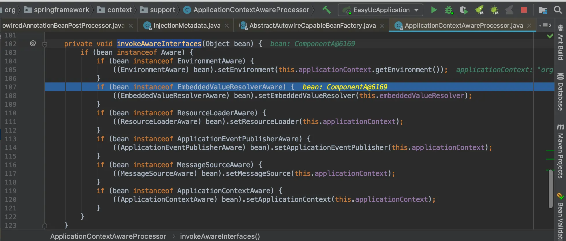 F7进入AbstractAutowireCapableBeanFacotry的doCreateBean(573)行来到initializeBean(1678)行F7进入invokeAwareMethods(1686)行 我们的示例代码ComponetA implements BeanFactoryAware, 所以这块会回调setBeanFactoryF8执行完invokeAwareMethods 符合我们生命周期图的预期,打印了$setBeanFactory()...F8跳回到initializeBean(1691)行F7跟进去,到了AbstractAutowireCapableBeanFacotry的applyBeanPostProcessorsBeforeInitialization(411)行 跟到416行时候可以发现两个事情,第一个是这里面通常执行的是*AwareProcessor且是在invokeAwareMethods后面执行的,符合我们生命周期图,第二个是ApplicationContextAwareProcessor是默认给我们所有bean都创建的*AwareProcessor,我们来看下这个ApplicationContextAwareProcessor是干什么的。F7进入applyBeanPostProcessorsBeforeInitialization(416)行,来到了ApplicationContextAwareProcessor的postProcessBeforeInitialization(79)行,F8一直跟到invokeAwareInterfaces(96)行F7进入invokeAwareInterfaces(96)行,来到了invokeAwareInterfaces(102)行 原来还会帮我们默认加ApplicationContextAwareProcessor,如果我们实现了这些接口,它就会回调。我们的示例代码中ComponentA implements ApplicationContextAware,所以应该会执行ComponentA的setApplicationContextF8跟到invokeAwareInterfaces(102)这个方法的最后,看下打印结果。 符合我们直接执行的*Aware接口,生命周期要早于*AwareProcessor。