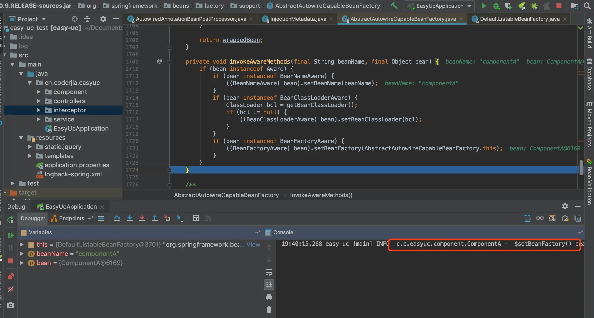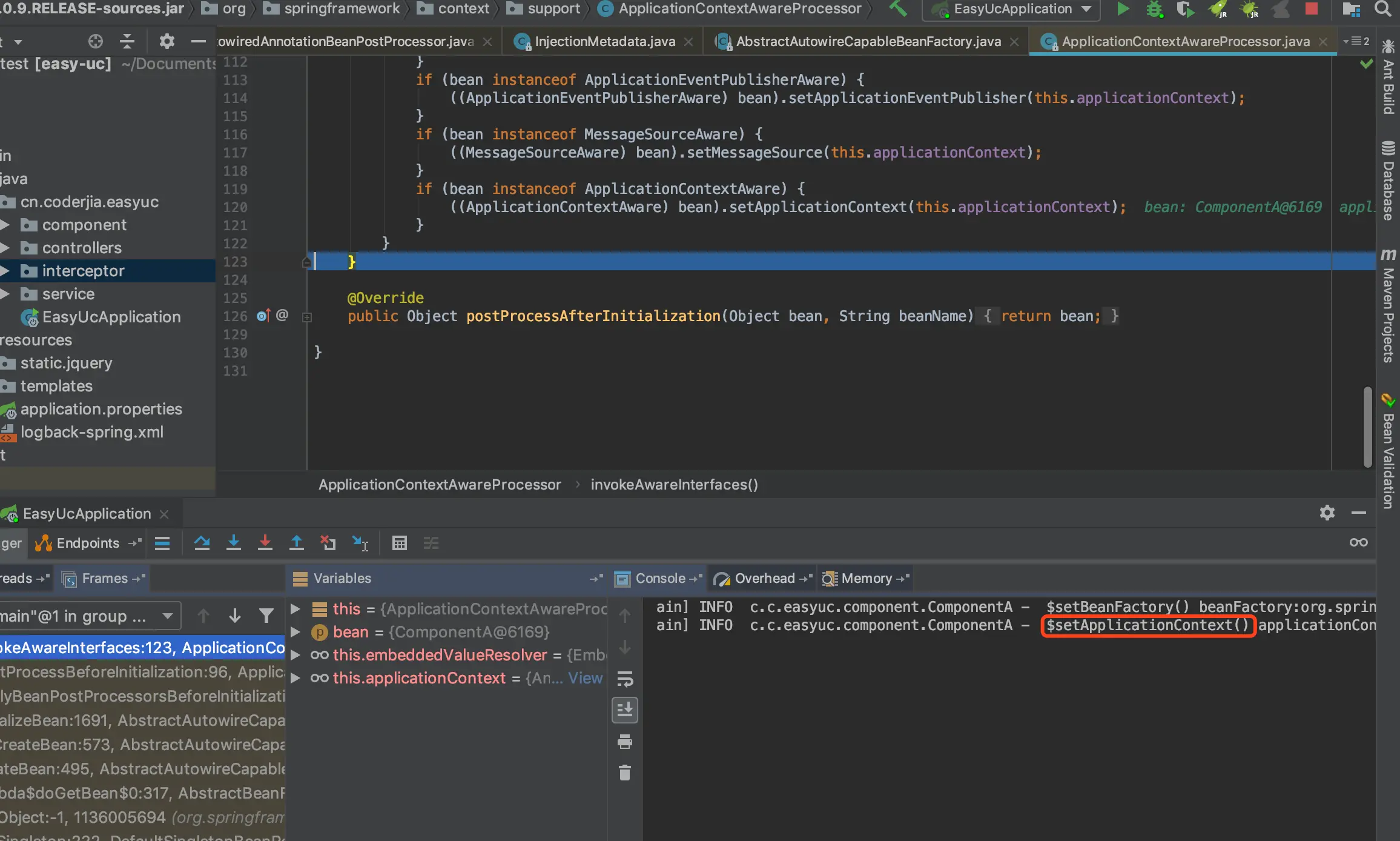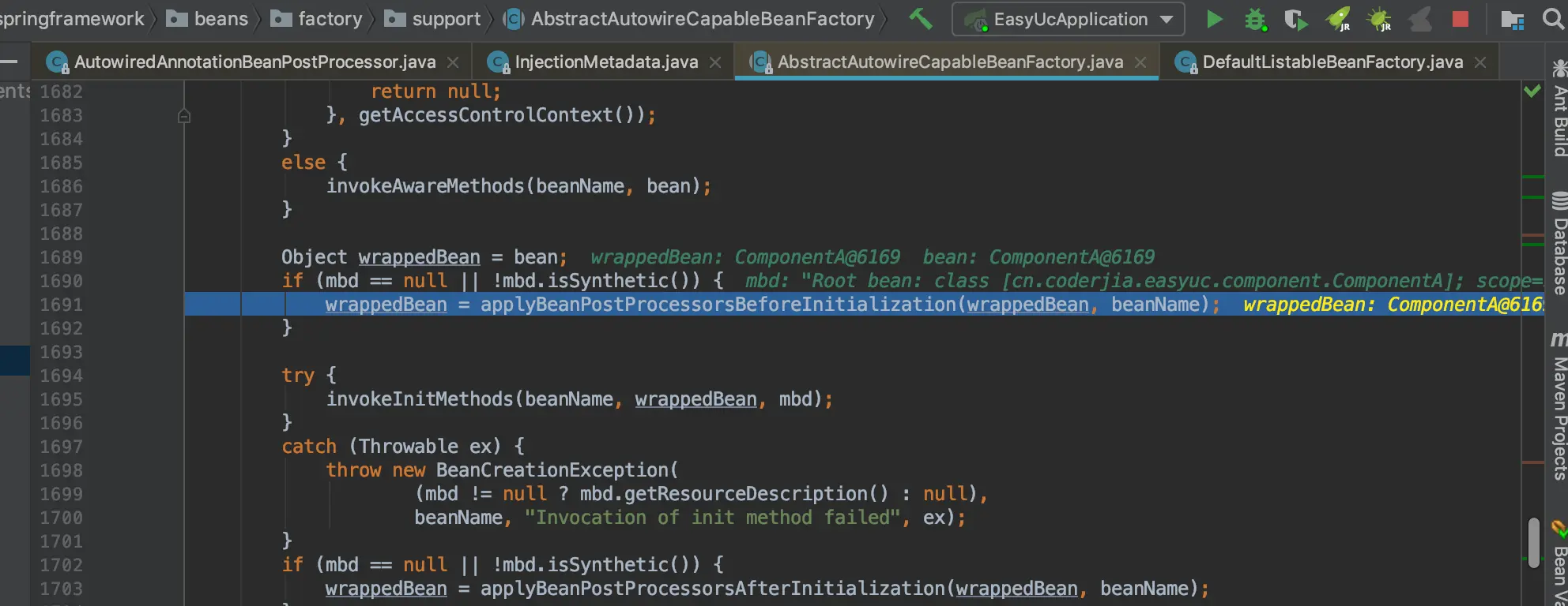 F7进入AbstractAutowireCapableBeanFacotry的doCreateBean(573)行来到initializeBean(1678)行F7进入invokeAwareMethods(1686)行 我们的示例代码ComponetA implements BeanFactoryAware, 所以这块会回调setBeanFactoryF8执行完invokeAwareMethods 符合我们生命周期图的预期,打印了$setBeanFactory()...F8跳回到initializeBean(1691)行F7跟进去,到了AbstractAutowireCapableBeanFacotry的applyBeanPostProcessorsBeforeInitialization(411)行 跟到416行时候可以发现两个事情,第一个是这里面通常执行的是*AwareProcessor且是在invokeAwareMethods后面执行的,符合我们生命周期图,第二个是ApplicationContextAwareProcessor是默认给我们所有bean都创建的*AwareProcessor,我们来看下这个ApplicationContextAwareProcessor是干什么的。F7进入applyBeanPostProcessorsBeforeInitialization(416)行,来到了ApplicationContextAwareProcessor的postProcessBeforeInitialization(79)行,F8一直跟到invokeAwareInterfaces(96)行F7进入invokeAwareInterfaces(96)行,来到了invokeAwareInterfaces(102)行 原来还会帮我们默认加ApplicationContextAwareProcessor,如果我们实现了这些接口,它就会回调。我们的示例代码中ComponentA implements ApplicationContextAware,所以应该会执行ComponentA的setApplicationContextF8跟到invokeAwareInterfaces(102)这个方法的最后,看下打印结果。 符合我们直接执行的*Aware接口,生命周期要早于*AwareProcessor。