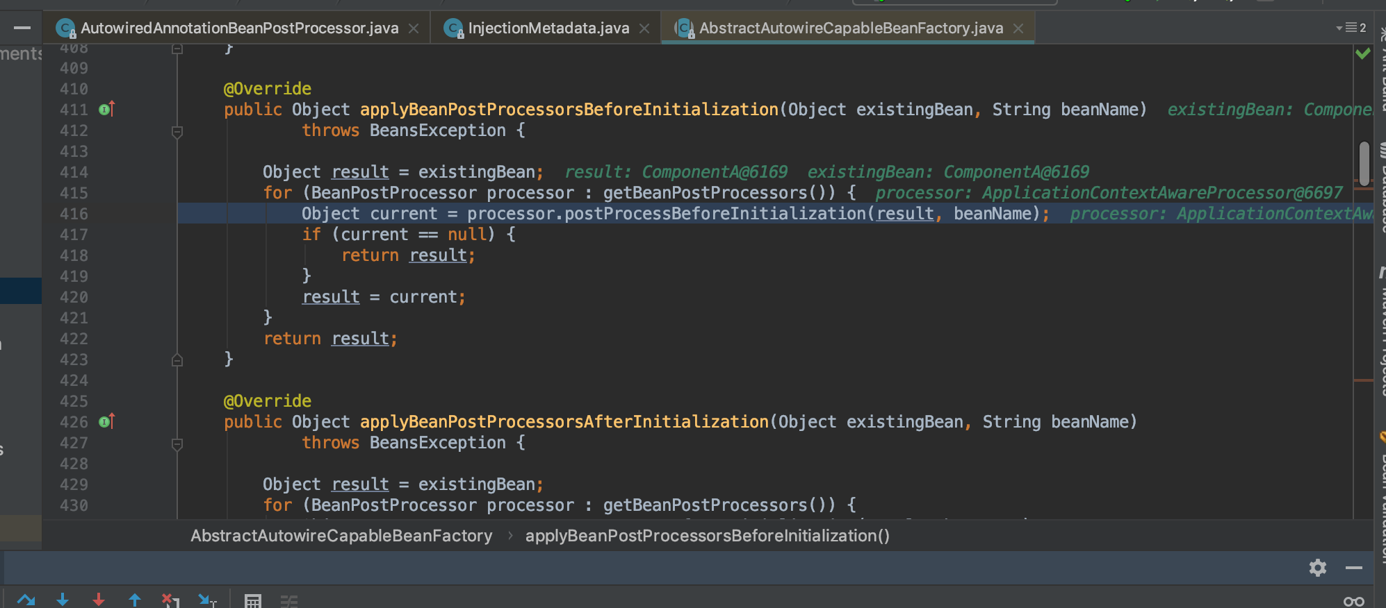 F7跟进去,到了AbstractAutowireCapableBeanFacotry的applyBeanPostProcessorsBeforeInitialization(411)行 跟到416行时候可以发现两个事情,第一个是这里面通常执行的是