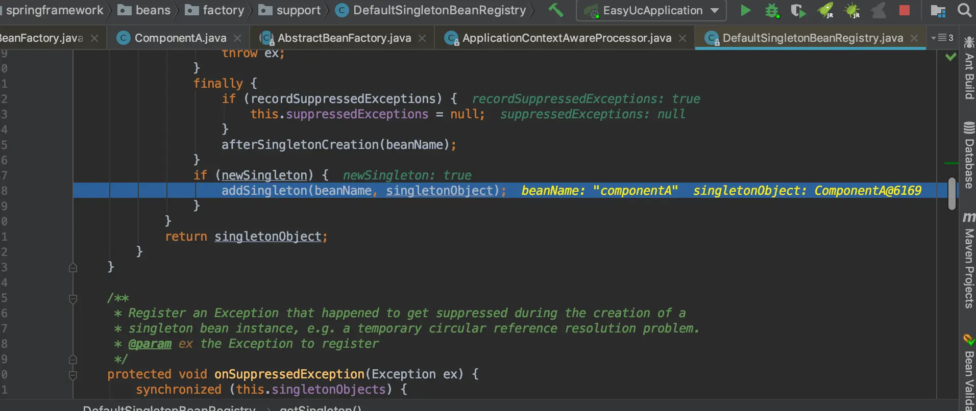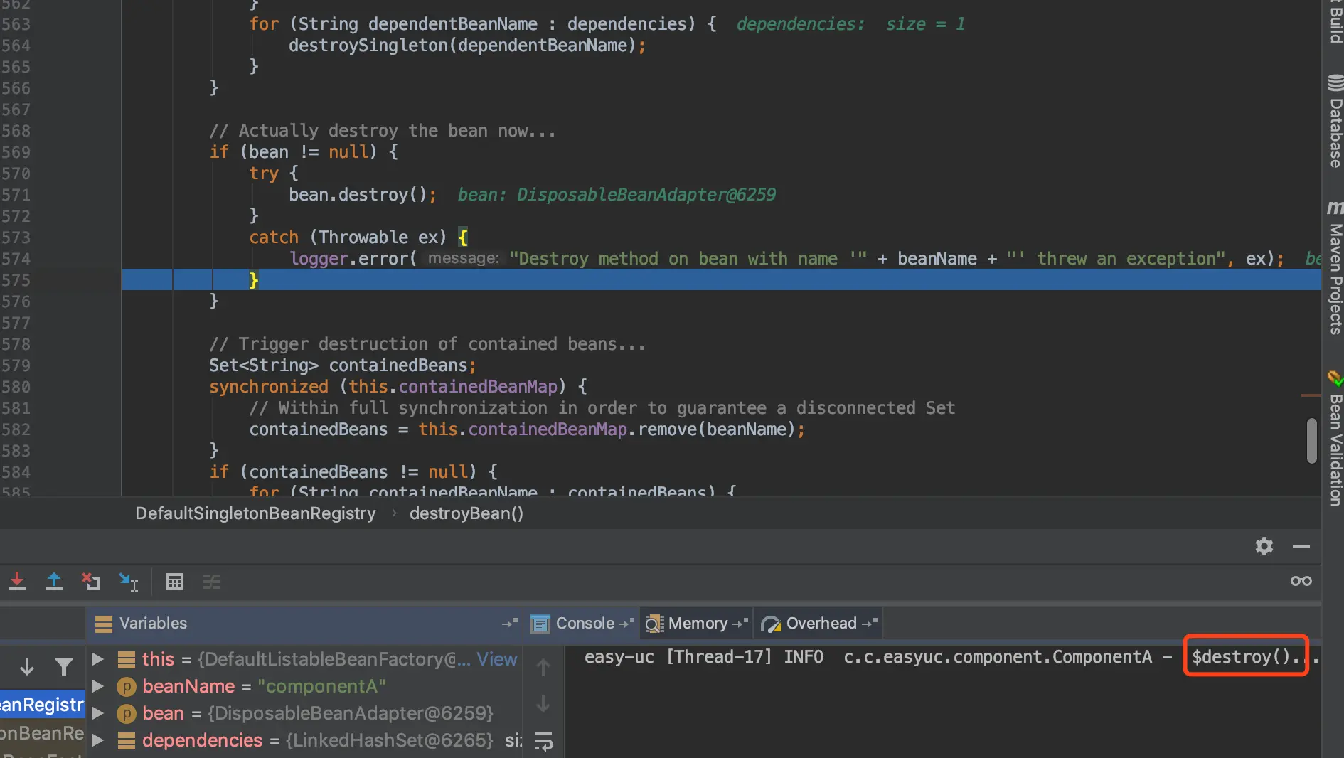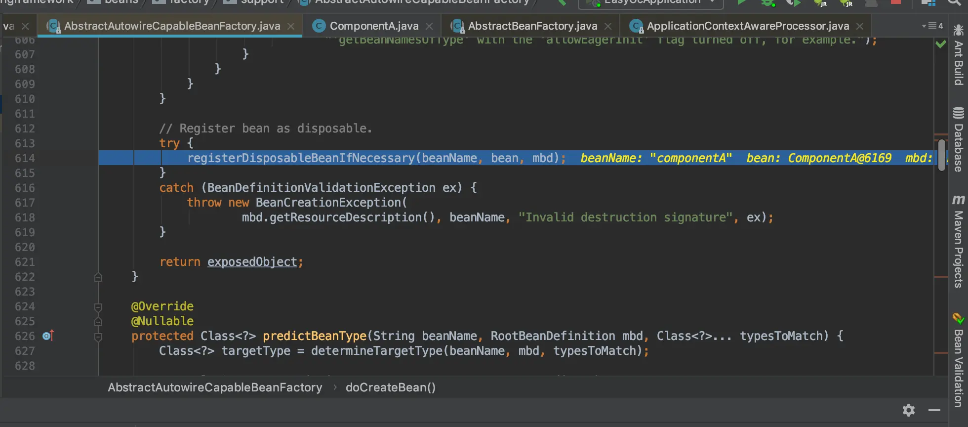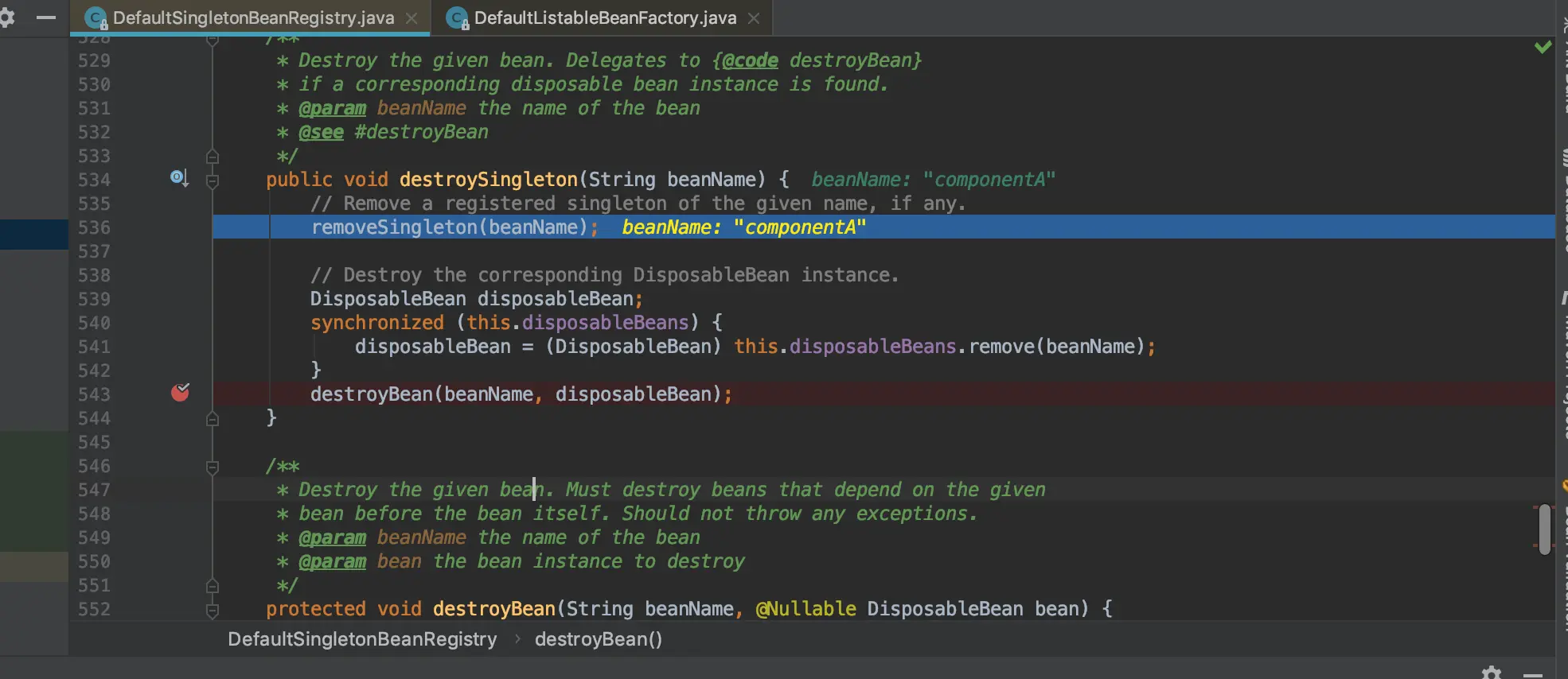 F7跟进到DefaultSingletonBeanRegistry的destroySingletons(491)行,在504行打个断点。我们上文说到ComponentA注册为DisposableBean,F9跳到ComponetA。F7进入此方法,F8跟到543行, F7进入此方法,F8跟到destroyBean(571)行并F8执行