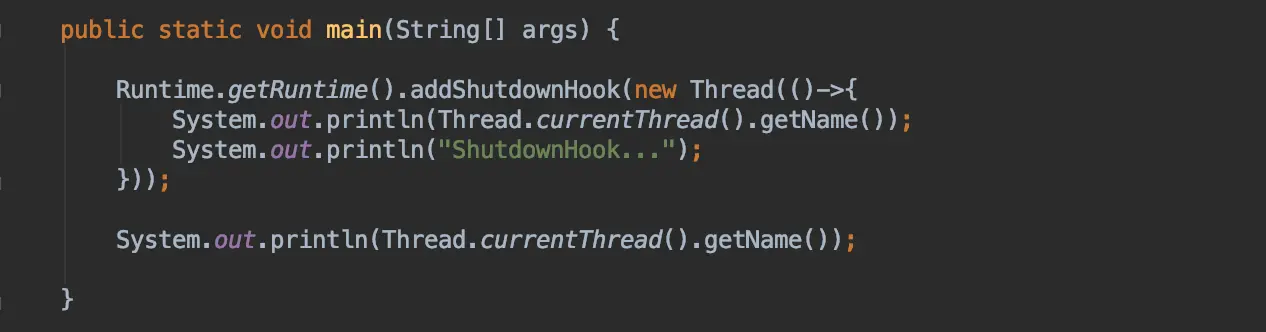 Runtime.getRuntime().addShutdownHook(Thread hook),写段测试代码。 运行结果: 当main方法执行结束,相当于System.exit(0)退出,就会回调是添加的Hook Thread,Spring也是这样做的。 - 理解