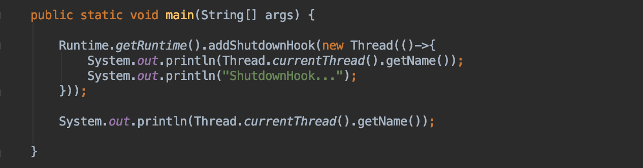 Runtime.getRuntime().addShutdownHook(Thread hook),写段测试代码。 运行结果: