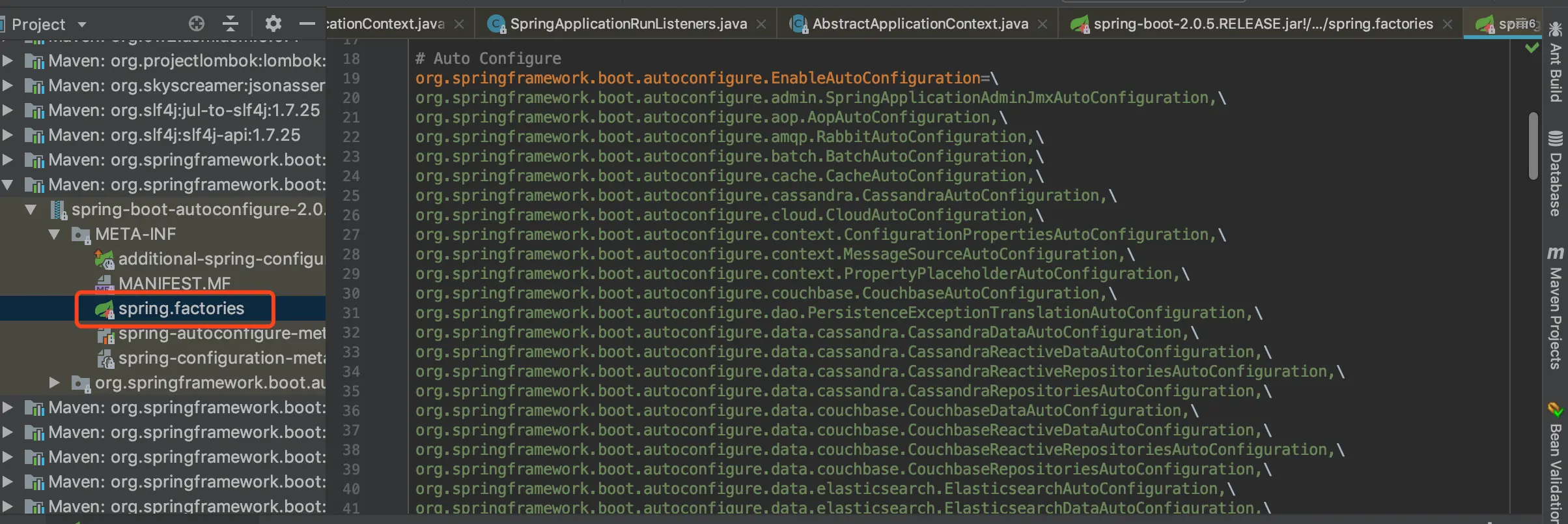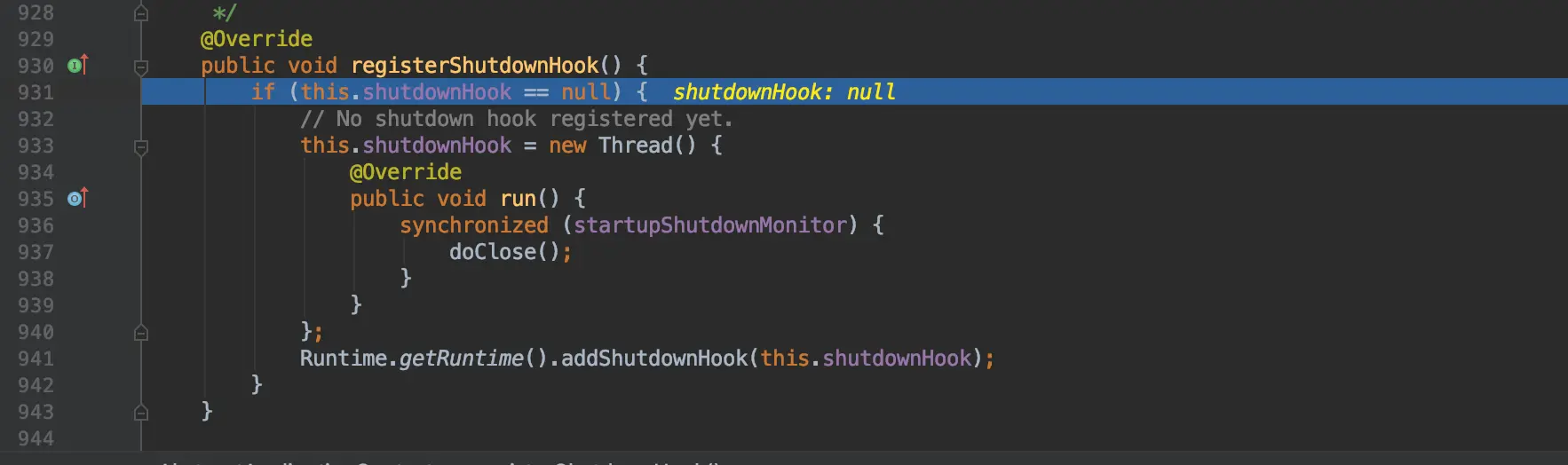 Spring的钩子线程,找到SpringApplication的run(333)行,进入refreshContext(333)行,来到SpringApplication的415行,F7进入此方法,来到AbstractApplicationContext的registerShutdownHook(930)行 这段代码与我们的示例代码类似,这个钩子当系统退出时调用doClose()方法,这段小内容还要碎碎念个事儿,SpringBoot我们知道他帮我们自动装配了很多配置,其实本质是在spring.factories定义好需要自动装配的类,把定义好的类包装成Spring需要的BeanDefinition,剩下的事儿就交给Spring就好了。当然SpringBoot还有自己完整的事件发布体系(观察者模式),让整个SpringBoot的代码结构看起来非常清晰。这些话虽然有些跑题,但是这就是我为什么搞SpringBoot starter却进入了Spring的世界。 - 一个不得不说的点