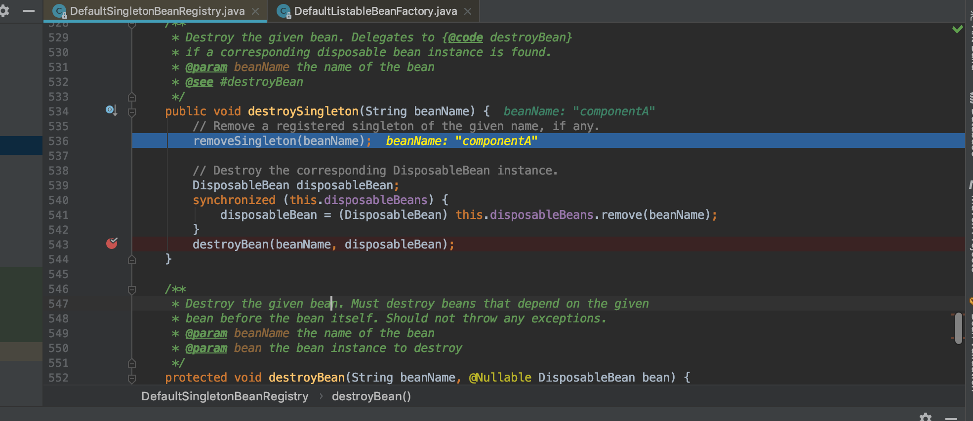 F7跟进到DefaultSingletonBeanRegistry的destroySingletons(491)行,在504行打个断点。我们上文说到ComponentA注册为DisposableBean,F9跳到ComponetA。F7进入此方法,F8跟到543行,
