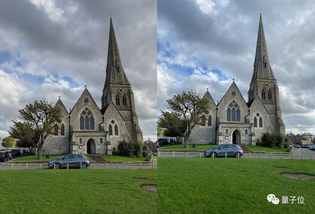 而Pixel拍摄同样的景色,天空、云朵和草坪的颜色更贴近人眼看到的真实场景,草坪会有一点偏黄,天空会有一点阴暗,教堂则充满了古朴的色调,整体更自然。