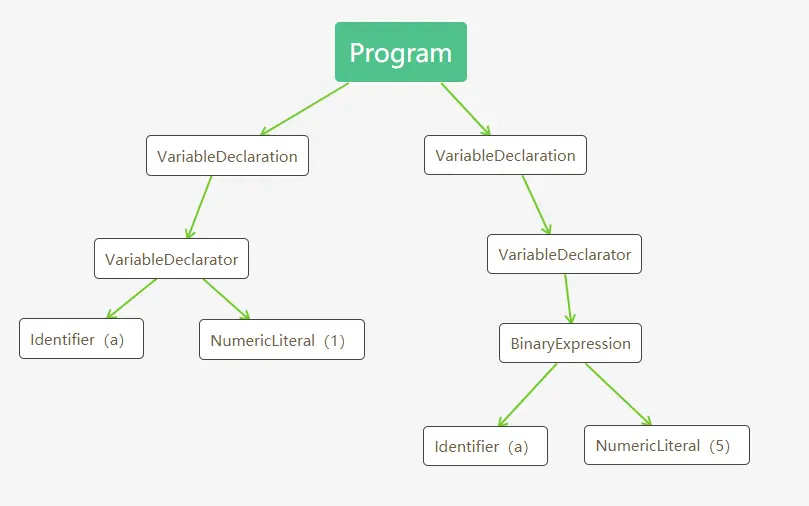 语法分析会将 token 结合当前语言(JS)的语法转换成 Node(节点),同时 Node 包含一个 type 属性记录当前的类型,例如 let 在 JS 中代表着一个变量声明的关键字,所以它的 type 为 VariableDeclaration,而 a = 1 会作为 let 的声明描述,它的 type 为 VariableDeclarator,而声明描述是依赖于变量声明的,所以是一种上下的层级关系