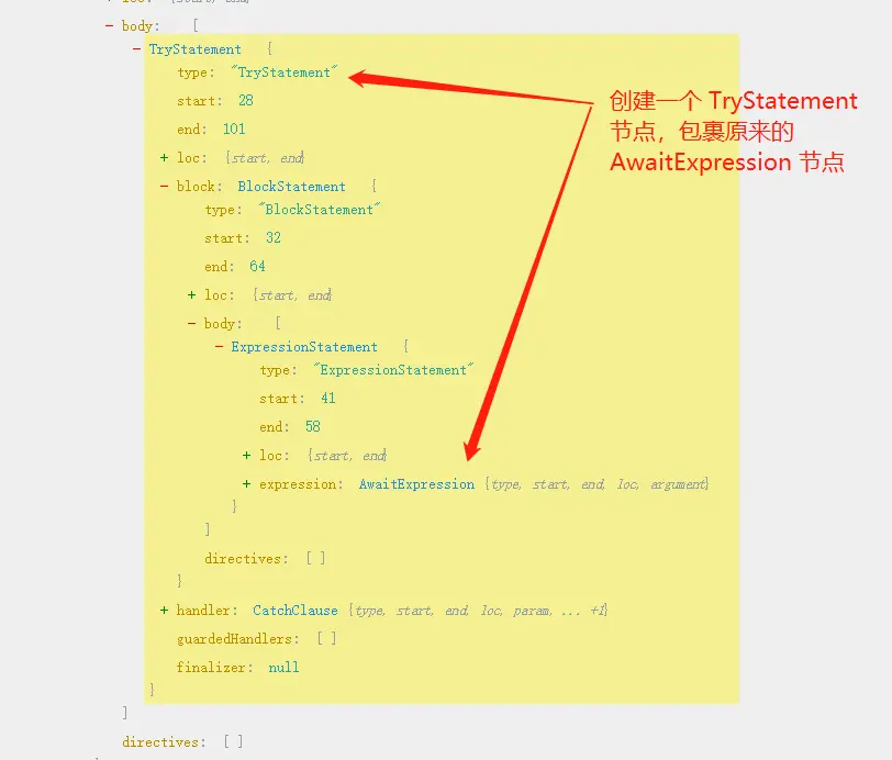 回到代码的实现,我们只需要通过 AST 树找到 await 表达式,将 await 外面包裹一层 try/catch 的 Node 节点即可