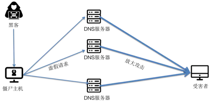 DNS面临着各种各样的网络安全威胁,它一直是网络基础架构中较弱的一环。 我们先来看看DNS服务器的威胁之一:DDoS攻击。DDoS攻击,即分布式拒绝服务攻击,攻击者通过控制大量的傀儡机,对目标主机发起洪水攻击,造成服务器瘫痪。 DDoS攻击通常分为流量型攻击和应用型攻击。以bps为单位的流量型的攻击,这类攻击会瞬间堵塞网络带宽;以qps为单位的应用层攻击,主要是将服务器的资源耗尽,攻击将造成DNS服务器反应缓慢直至再也无法响应正常的请求。DNS服务易受攻击的原因,除了专门针对DNS服务器发起的;还有就是利用DNS服务的特点,用“DNS放大攻击”对其他受害主机发起攻击。如下就是DNS放大攻击的示意图,DNS方法攻击的危害极大。