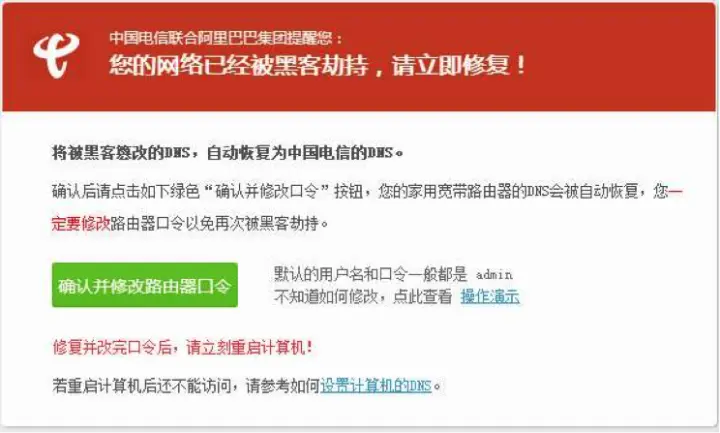 接下来,我们再来看看DNS劫持对DNS服务器会造成哪些威胁。DNS劫持是指攻击者在劫持的网络范围内拦截域名解析的请求,篡改了某个域名的解析结果。比如用户本来想访问www.aliyun.com,却被指引到了另一个假冒的地址上,从而达到非法窃取用户信息或其他不正常的网络服务的目的。对用户而言,DNS劫持是很难感知的,因此造成的影响极大。如2013年就爆发过一次大型的DNS钓鱼攻击事件,导致约800万用户感染。攻击者通常会通过两种方式实现DNS劫持,一种是直接攻击域名注册商或者域名站点获取控制域名的账户口令,这样可以修改域名对应的IP地址,另外一种方式是攻击权威名称服务器,直接修改区域文件内的资源记录。如下图,中国电信发现域名劫持时,给访问用户的提醒。